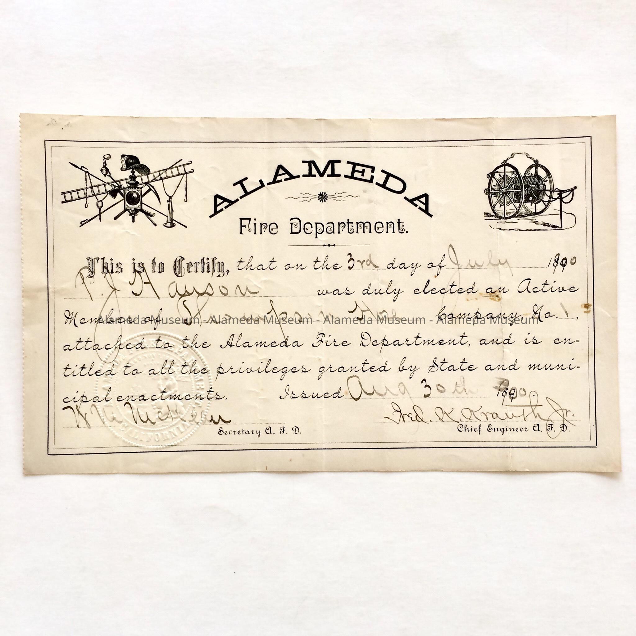 Description: Ornately printed certificate illustrated with fire fighting apparatus of the period. Bold heading "Alameda Fire Department." Blanks inscribed in script with sepia colored ink.