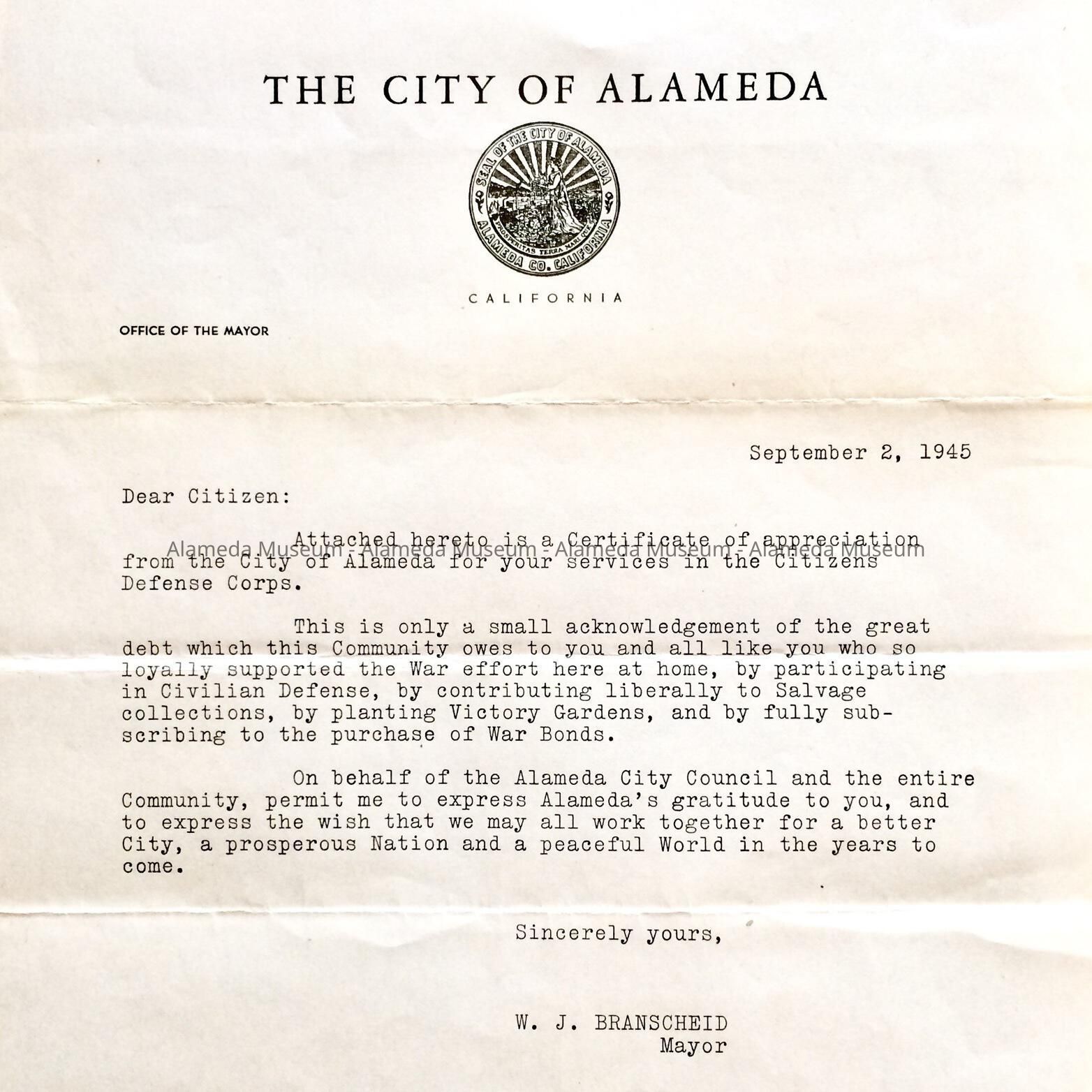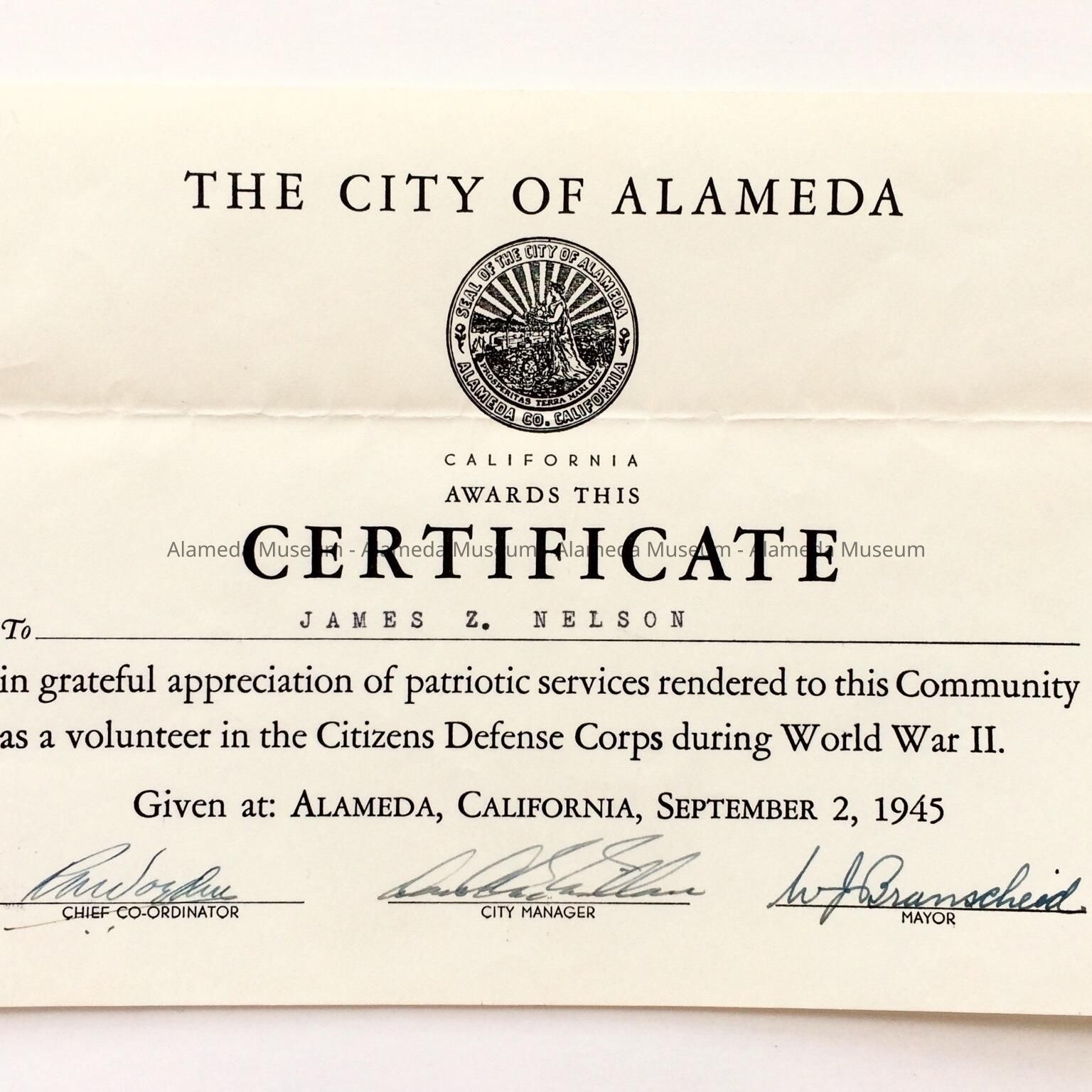 History of Object: A certificate of appreciation awarded by the City of Alameda to James Z. Nelson for his volunteer work with the Citizens Defense Corps during World War II.