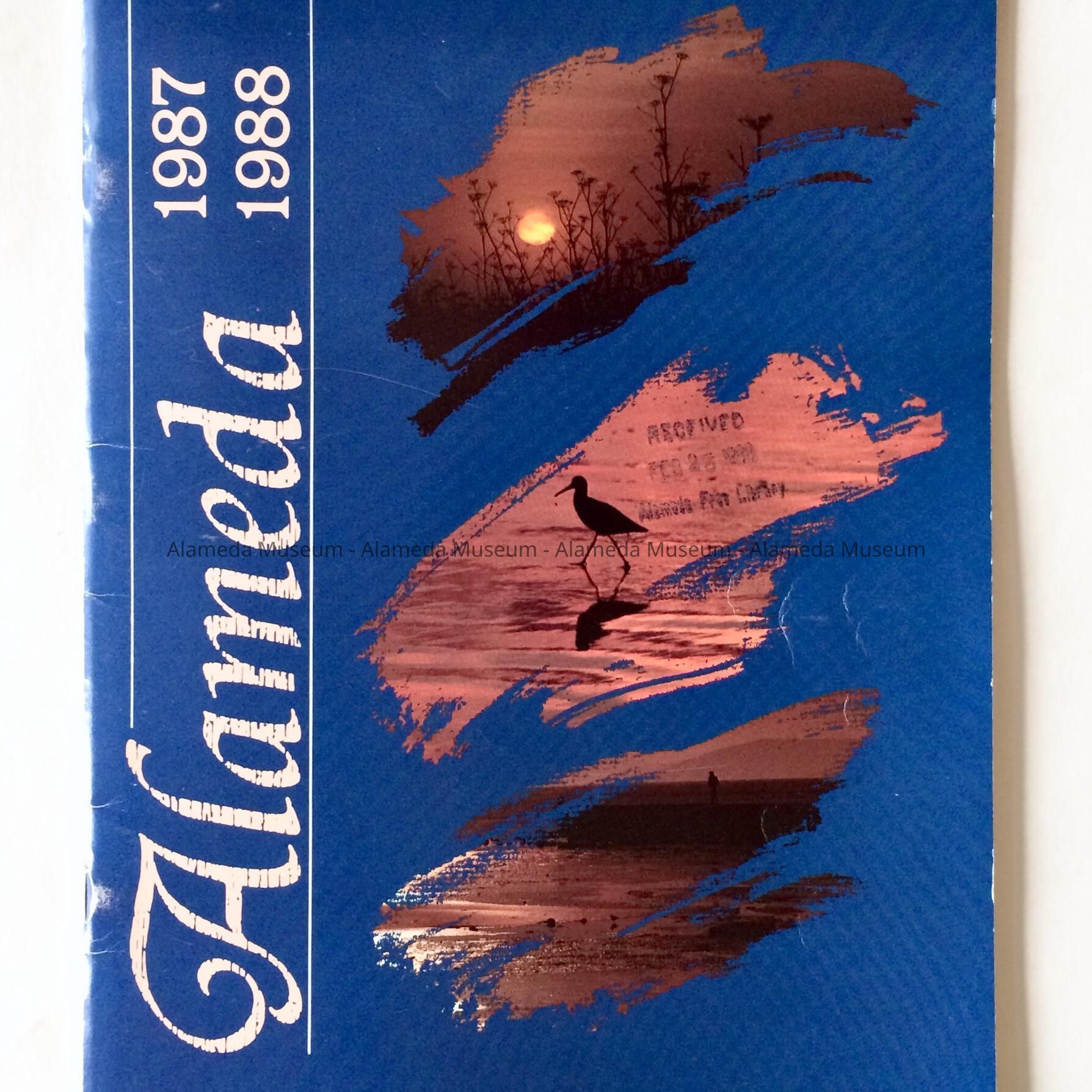 Description: A 48-page (excluding cover) color booklet, on glossy paper, with a front cover featuring sunset images (silhouette of invasive fennel; silhouette of a wading bird, possibly a willet, and a hiker on the Mount Trashmore trail) on a blue background, titled 'Alameda 1987 1988'. First page has a foreword by Donald A. Dowdell, 1986-1987 President of the Alameda Chamber of Commerce. Has a stamp, 'Received Feb 28, 1988 Alameda Free Library' on the middle image, and 'Alameda Clipping File History' handwritten in ballpoint pen on the first page.