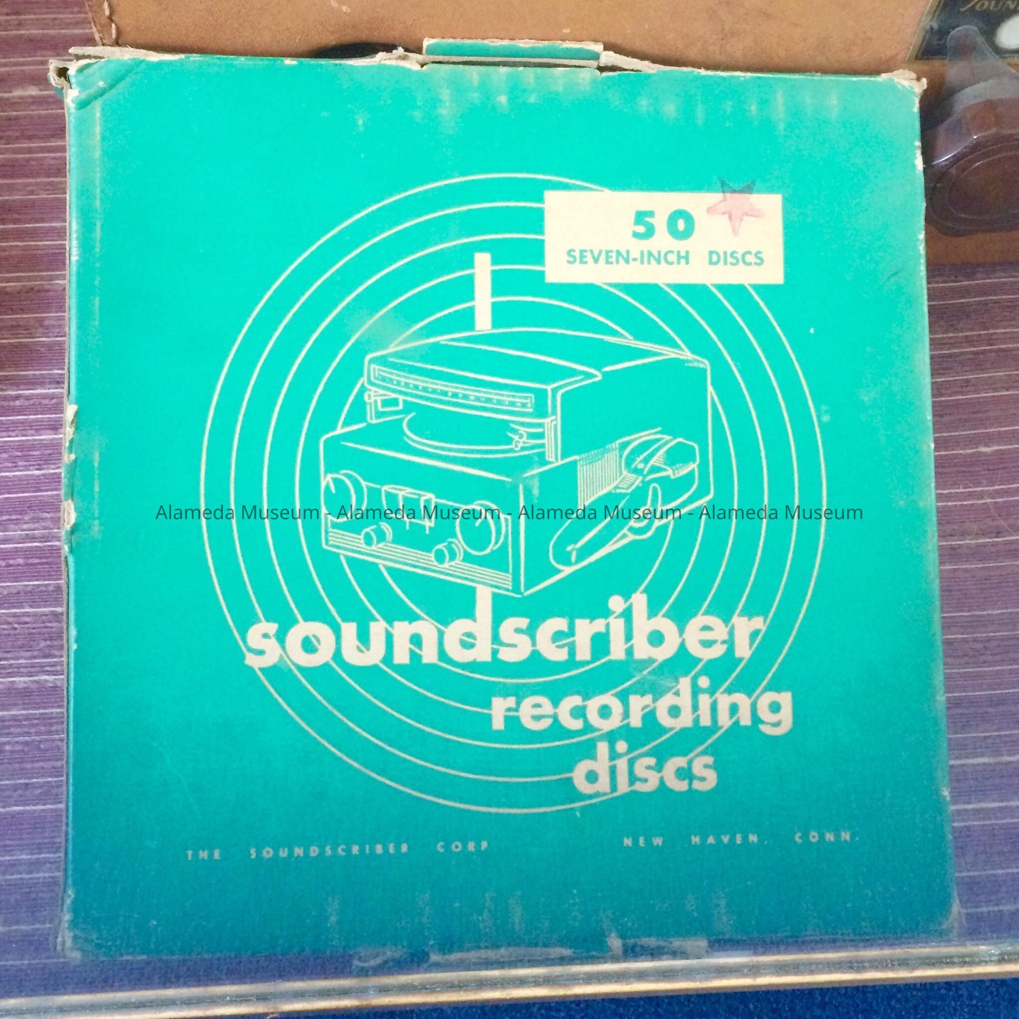 History of Object: Early recording device discs used on the Sound Scriber recording machine, found while moving the contents of the Chamber of Commerce from their building in the 21,00 block of Santa Clara Avenue to the basement of the Alameda City Hall. It is said to have been used by the Chamber of Commerce, which was founded in 1927.
