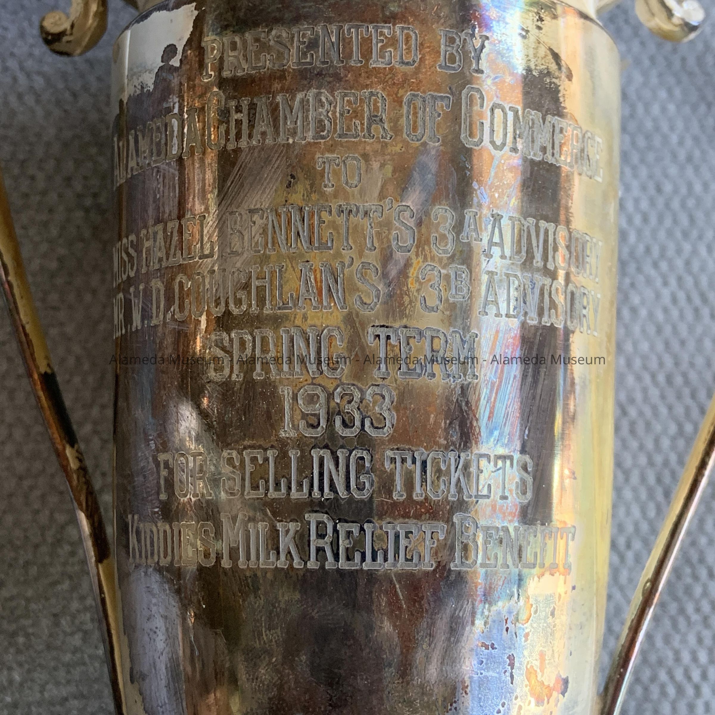 TROPHY ENGRAVED "PRESENTED BY ALAMEDA CHAMBER OF COMMERCE TO MISS HAZEL BENNETT'S 3-A ADVISORY." " MR W D COUGH LAN'S 3-B ADVISORY, SPRING TERM, 1933, FOR SELLING TICKETS FOR THE KIDDIE'S MILK RELIEF BENEFIT."