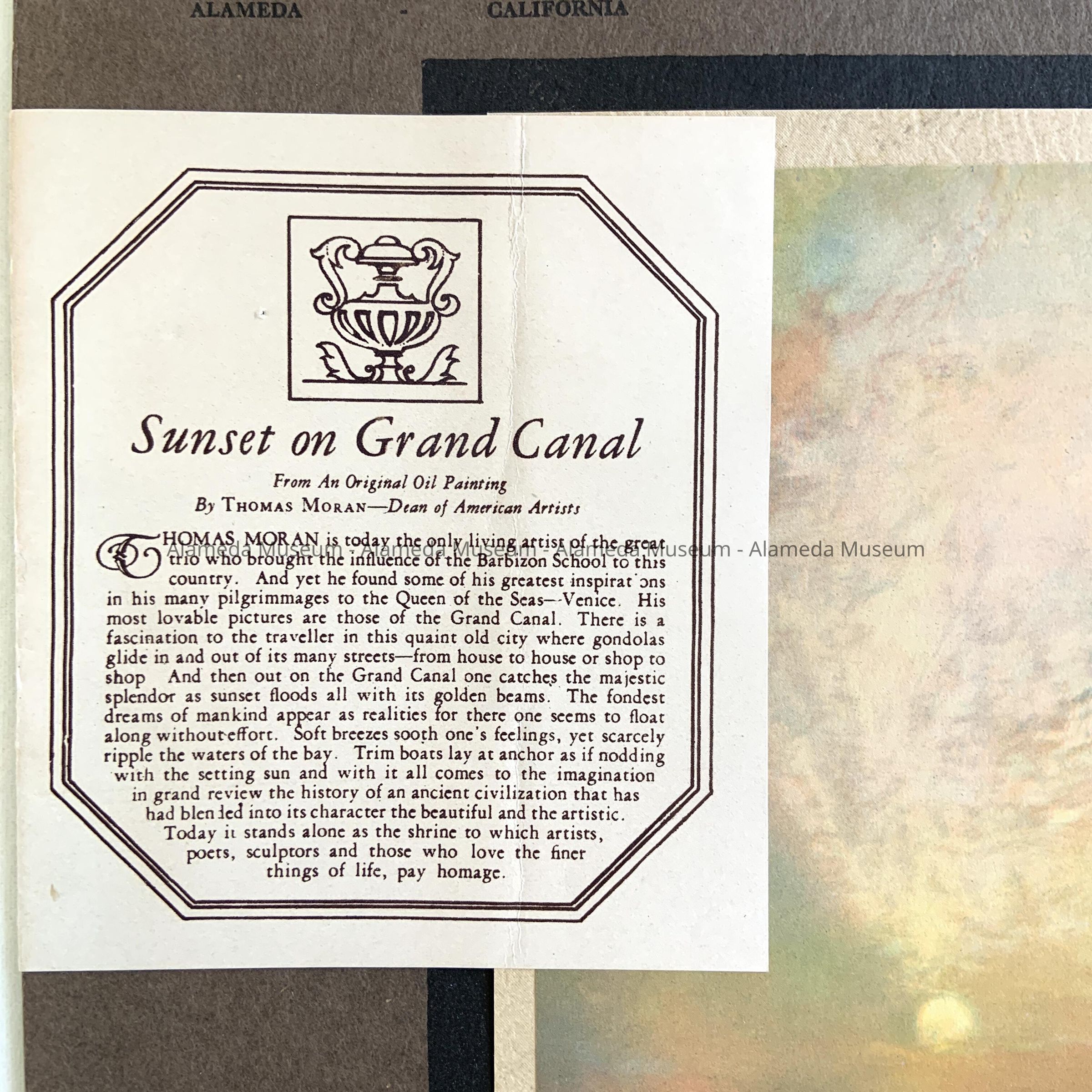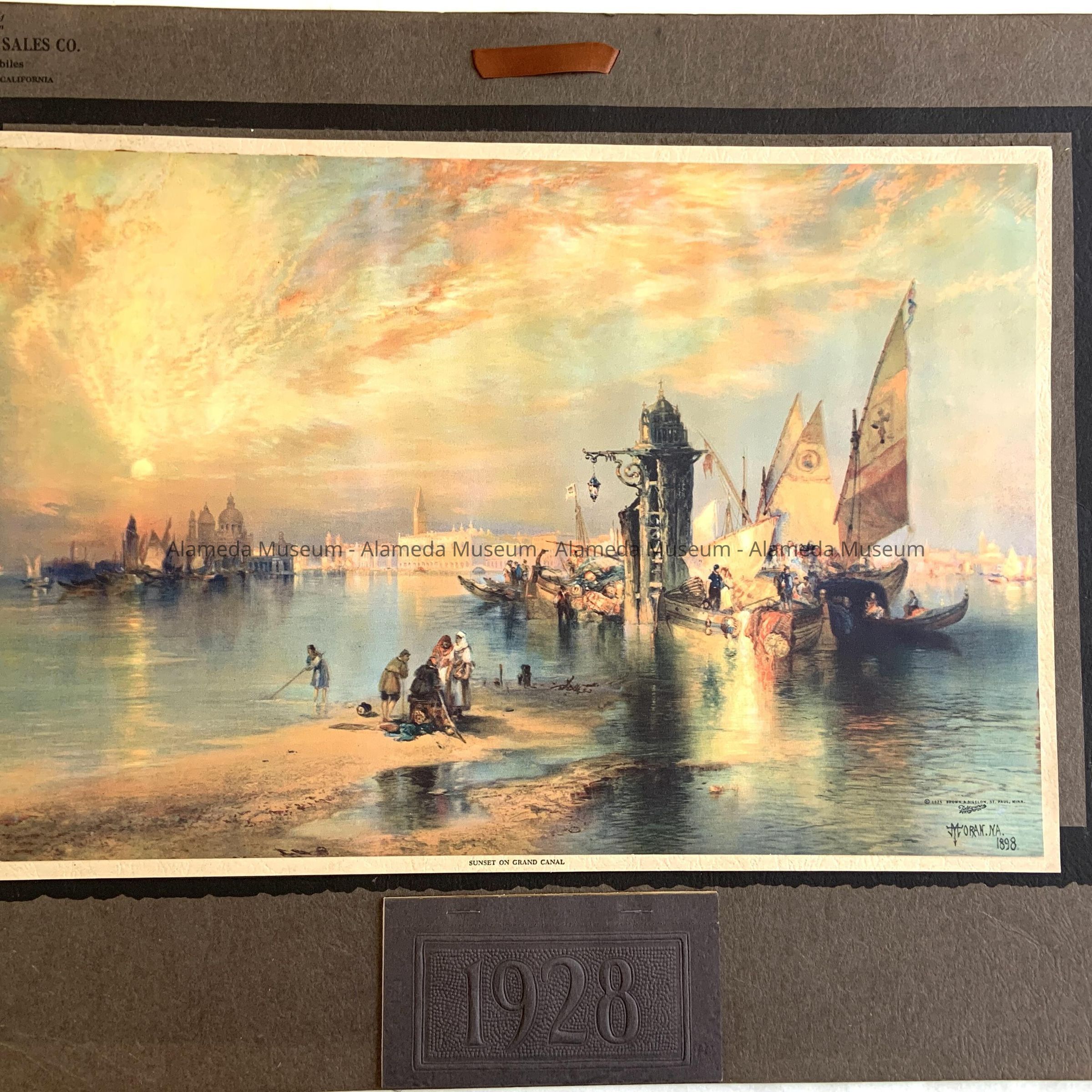 Colored lithographic calendar, which is a replication of a binding entitled, "SUNSET ON THE GRAND CANAL," by Thomas Moran. Loose-leaf calendar is unused. Print is mounted to heavy brown-colored stock paper, with bold printed caption - "CHAPLIN MOTOR SALES COMPANY, ALAMEDA."