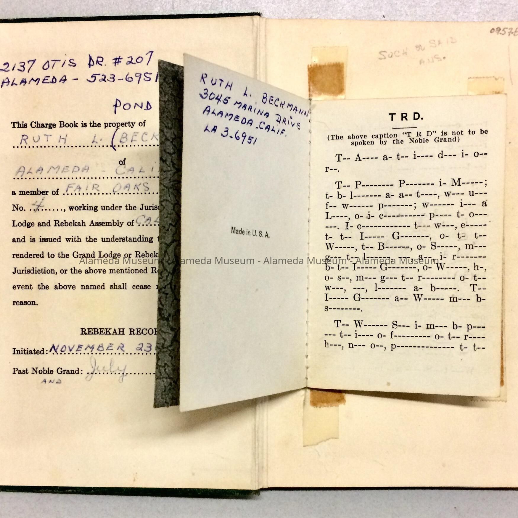 A CHARGE BOOK OF A REBEKAH LODGE OF THE ODD FELLOWS. THIS BELONGED TO RUTH BECKMANN WHO WAS INITIATED IN ALAMEDA ON NOVEMBER 3, 1933. SHE MARRIED CARL BECKMANN, IN 1936.