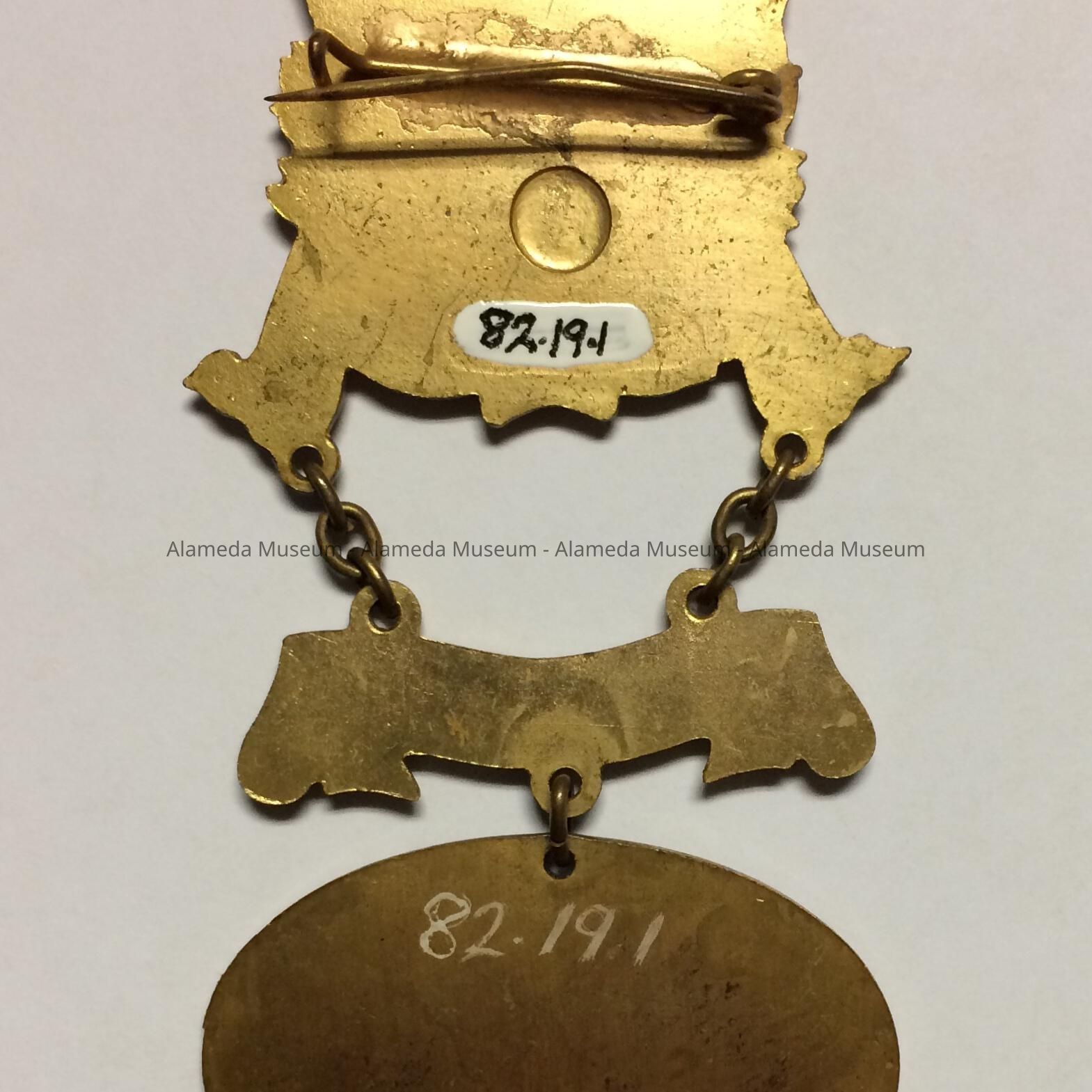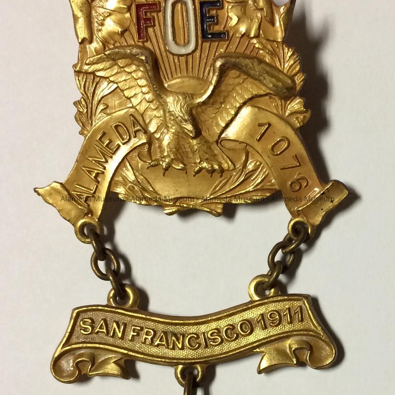 Fraternal metal, 3 separate parts joined by brass links. Central badge with pin contains motif of outstretched eagle with the initials F.O.E, Alameda 1076, this suspends a brass ribbon stating "San Francisco, 1911"; in turn this is attached to a circular medal, heading "Alameda's Beach", and depicts bathers with buildings in the distance.
