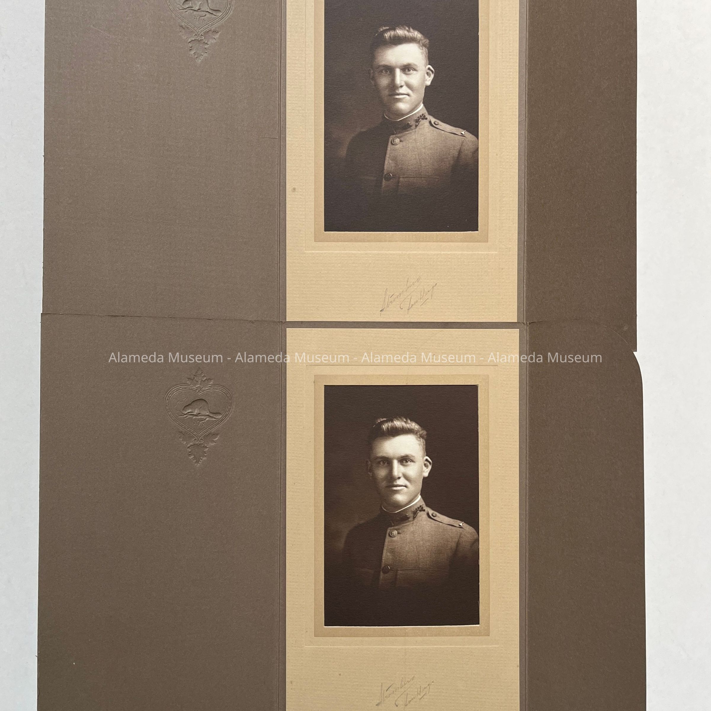 Description; A dark sepia-toned photo within a studio folder of similar color. The photographer's name, “Stromberg (?), San Diego”, is pencilled in at the bottom of the image.
