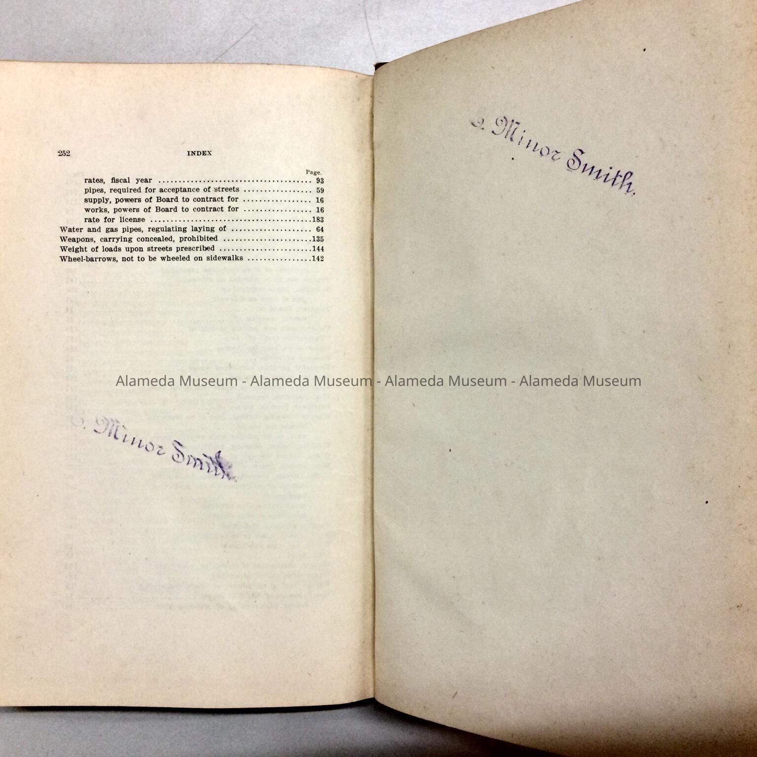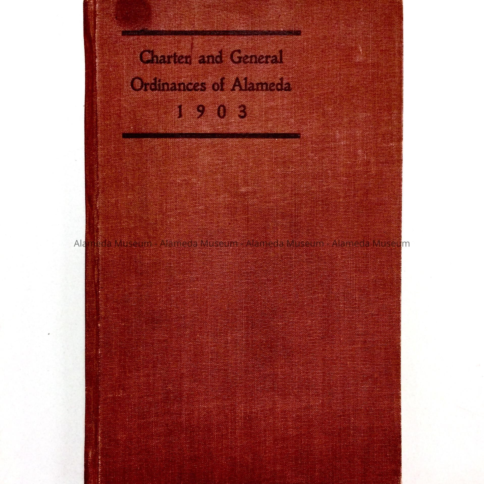History of Object: Charter and General Ordinances of the City of Alameda dated 1903. This particular volume belonged to E. Minor Smith, City Assessor from 1872 to 1909. Volume given in 1952 to Alameda Historical Society and never catalogued.