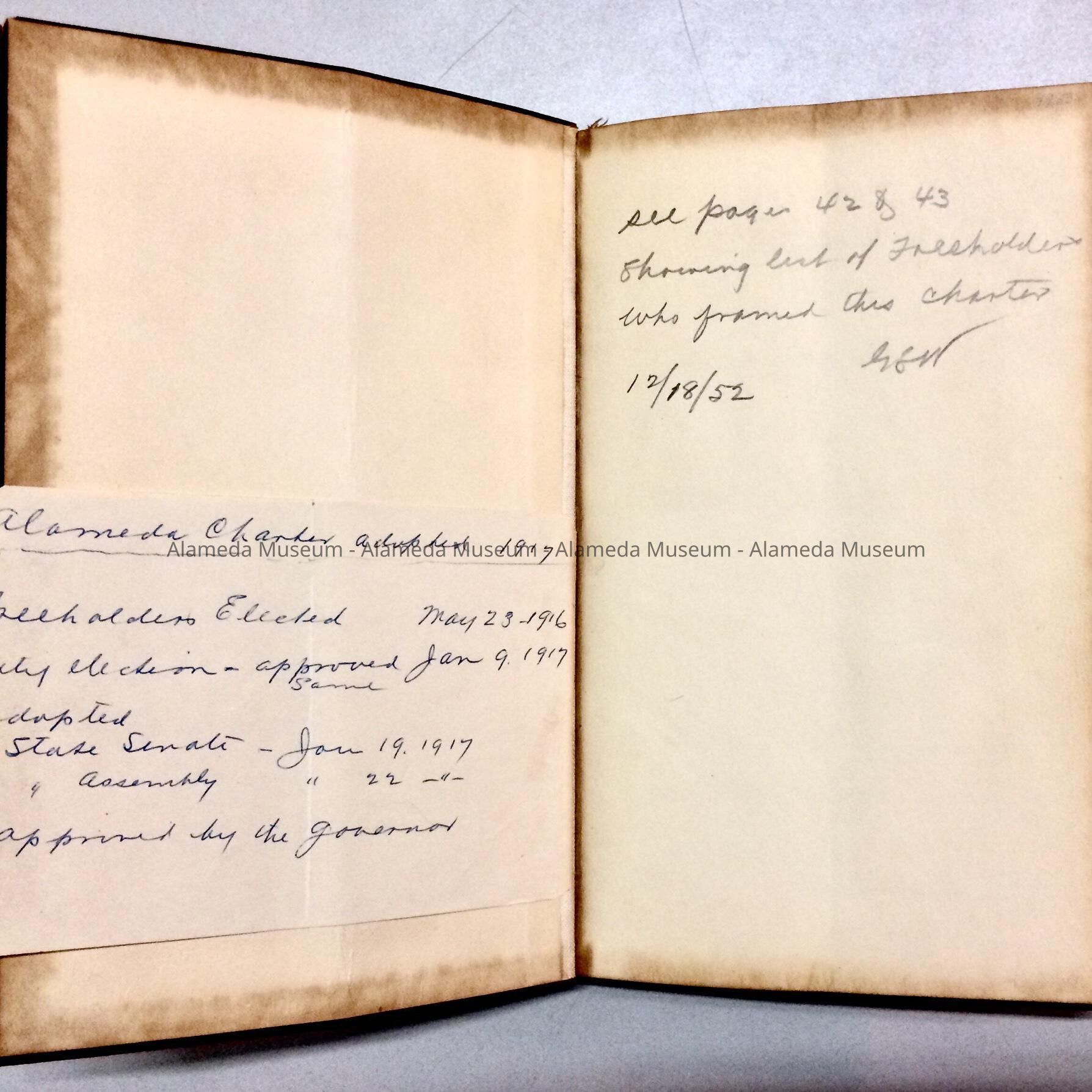History of Object: Bound copy of the Charter of the City of Alameda for 1917. This particular copy was owned by George S. Williams. Donated to the Alameda Historical Society before 1971 and never catalogued.