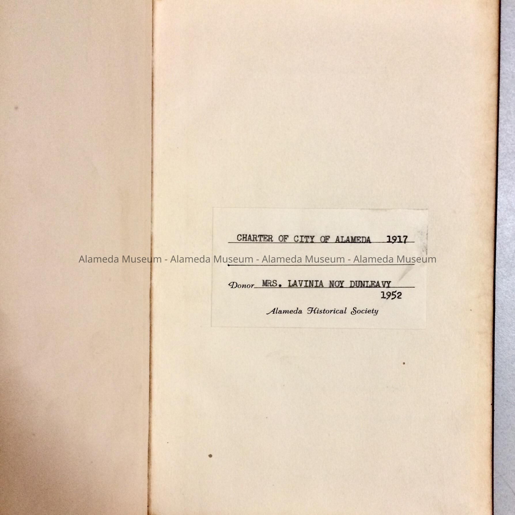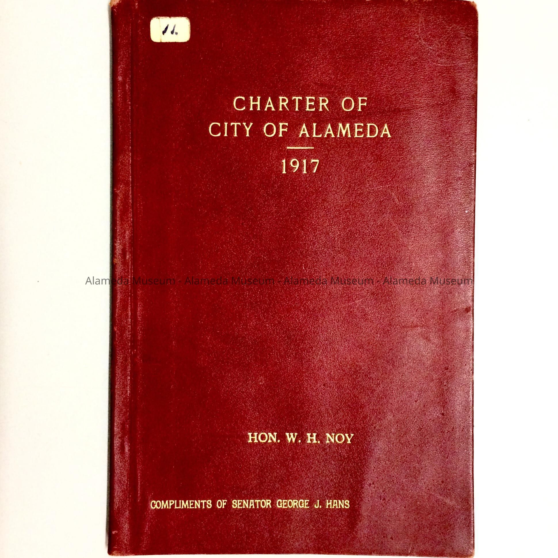 History of Object: Bound copy of the Charter of the City of Alameda for 1917. This particular copy belonged to the Honorable W.H. Noy, longtime Mayor, City of Alameda and a pioneer resident. It was donated in 1950 to the Alameda Historical Society, numbered 11, by his daughter, Lavinia Noy Dunleavy, and never catalogued.