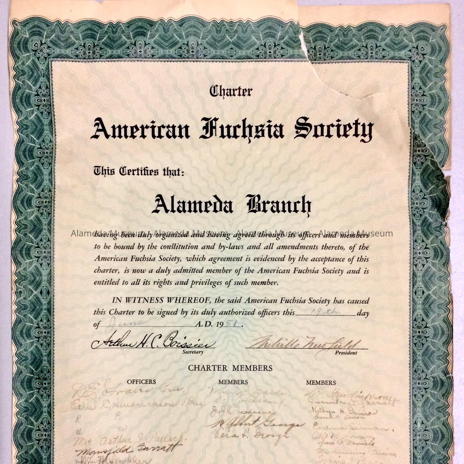 History: Charter of the American Fuchsia Society certifying the Alameda Branch of the organization dated June 19, 1951. The Charter contains the signatures of the original Charter officers and members.