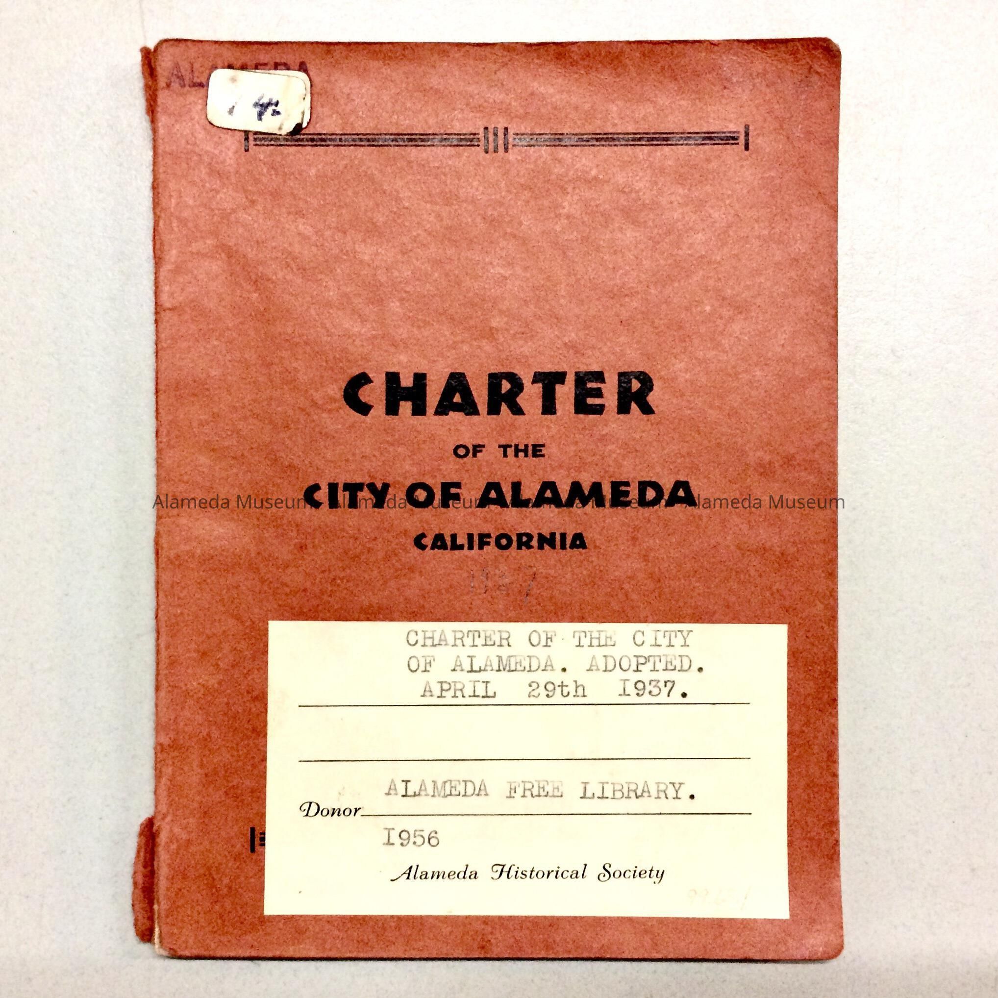 Copy of the Charter of the City of Alameda adopted 4/29/37. This particular copy was given to the Alameda Historical Society in 1956, numbered 14 and never cataloged.