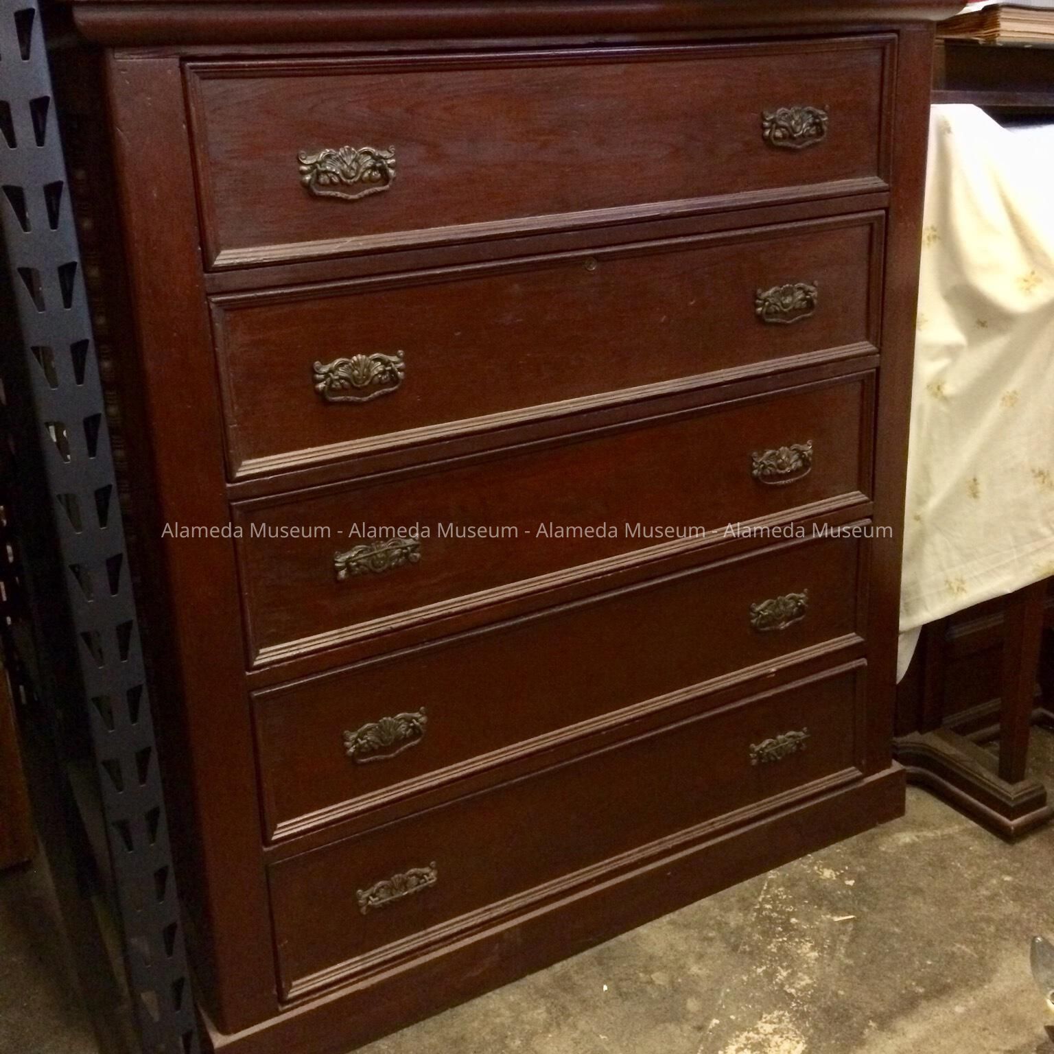 History of Object: Chest of drawers from the farm house of Mr. & Mrs. P. A. McDonell, pioneers of Bay Farm Island, Alameda.