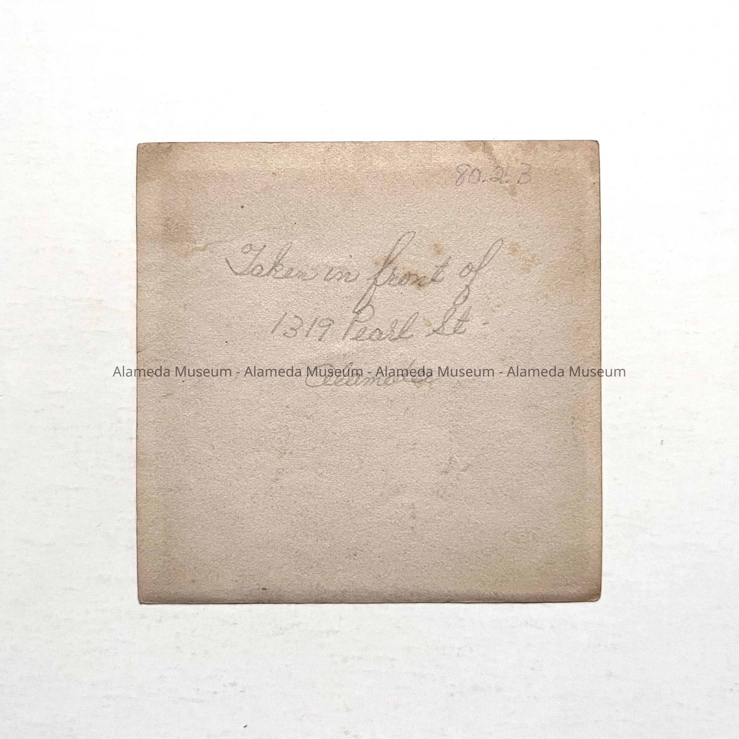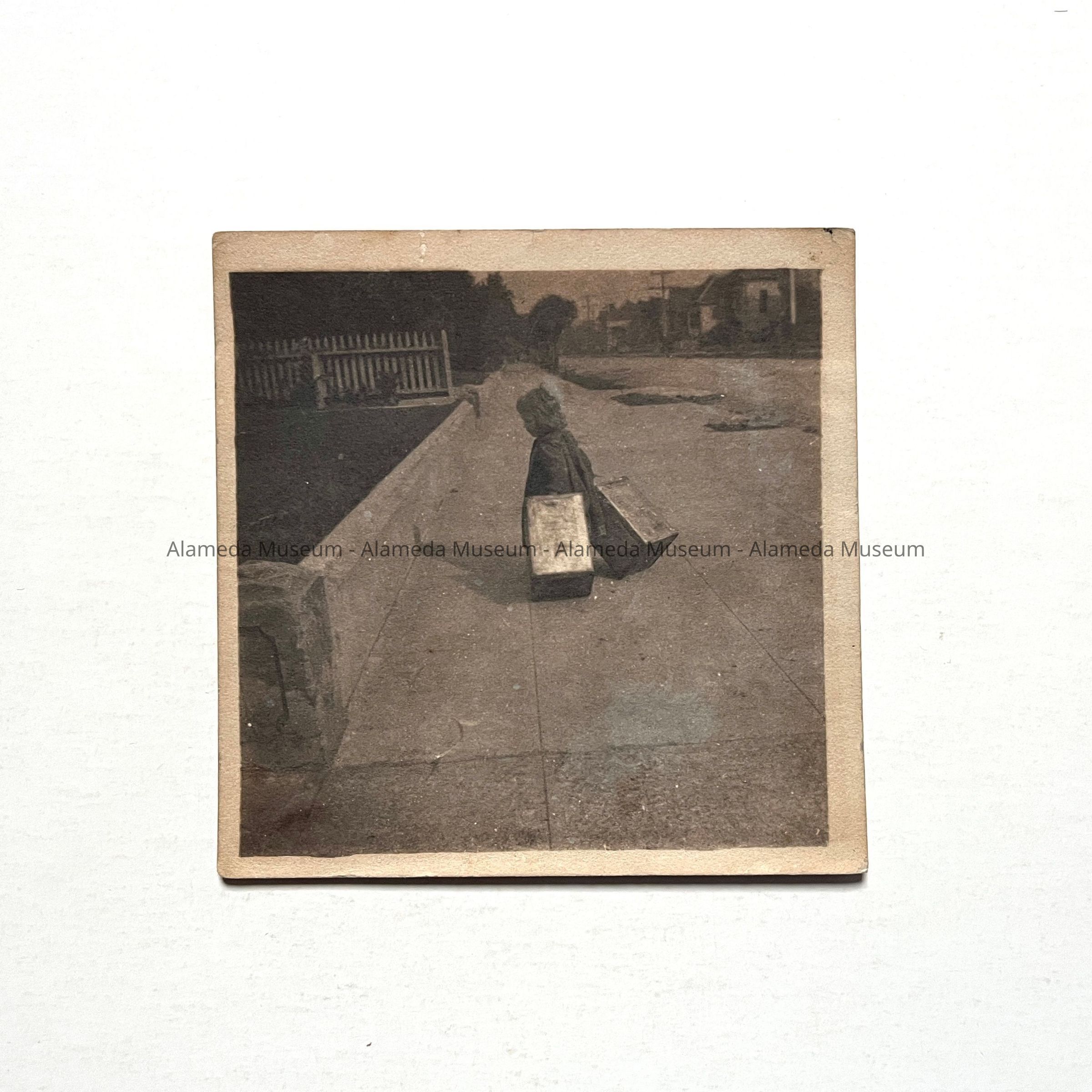 History of Object: child pulling two-gallon metal containers in front of 1319 Pearl street, Alameda. Child's identity unknown.