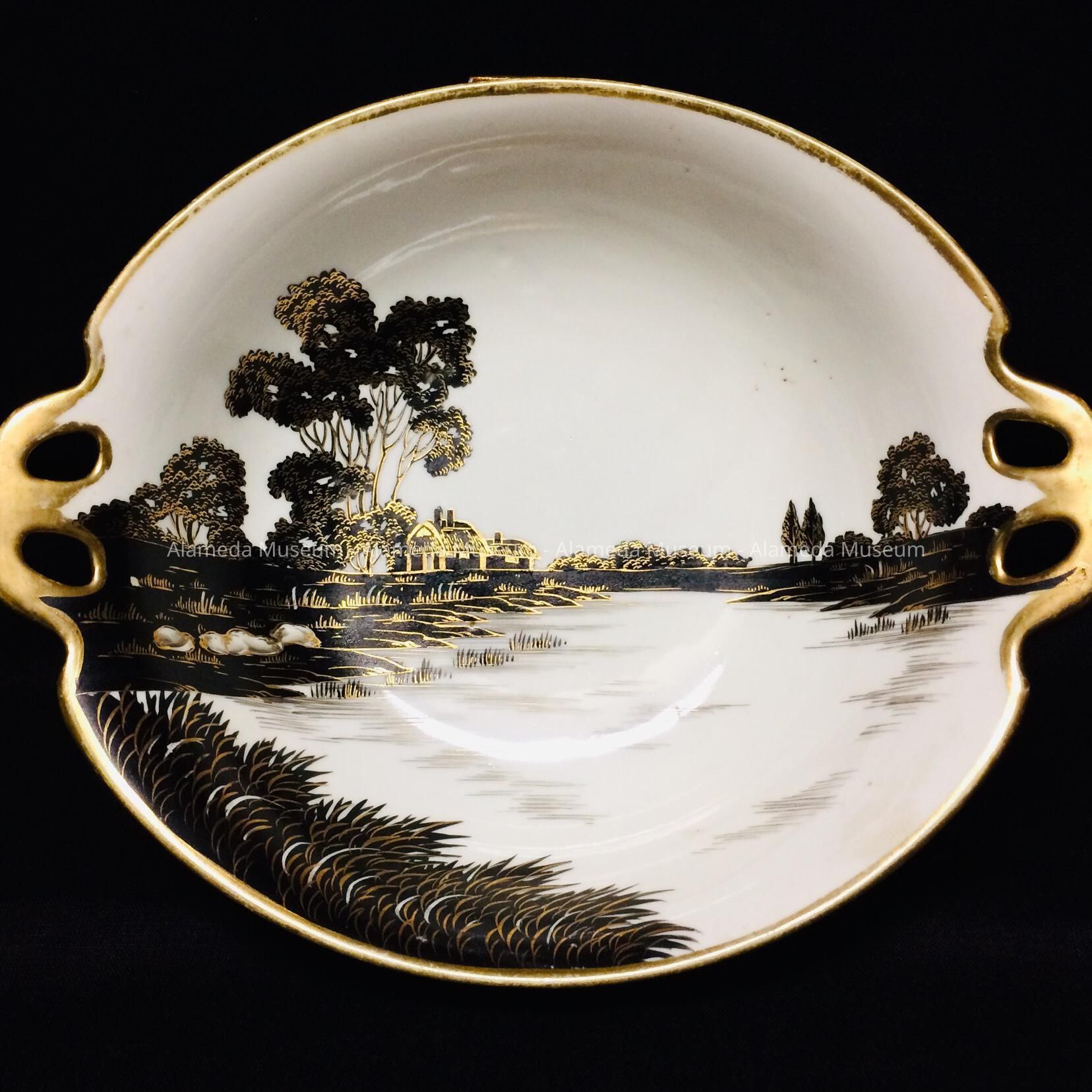 Description: A porcelain bowl with a hand painted scene of a river and cottages in black and gold colors. The gold rim of the bowl also serves as pierced handles. Marked on the bowl's bottom is, "M" and "Hand Painted Nippon".