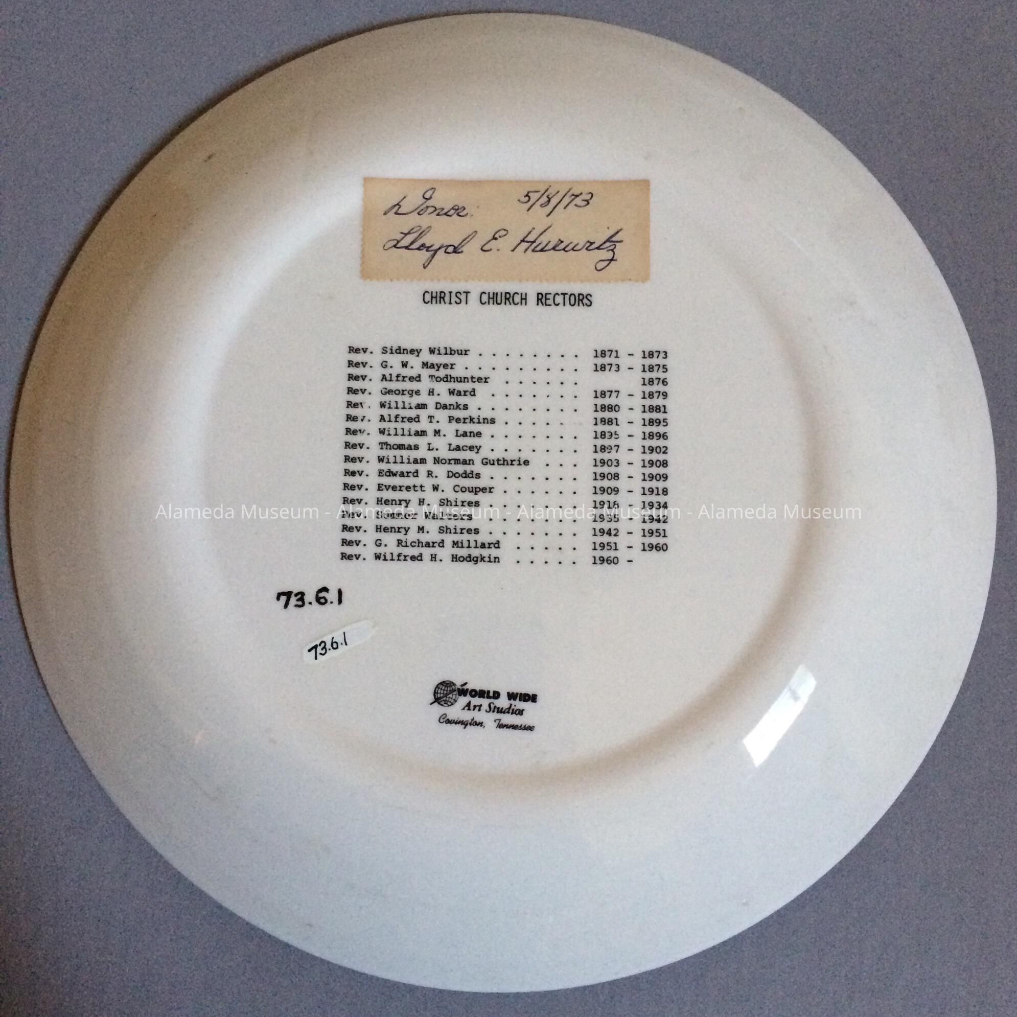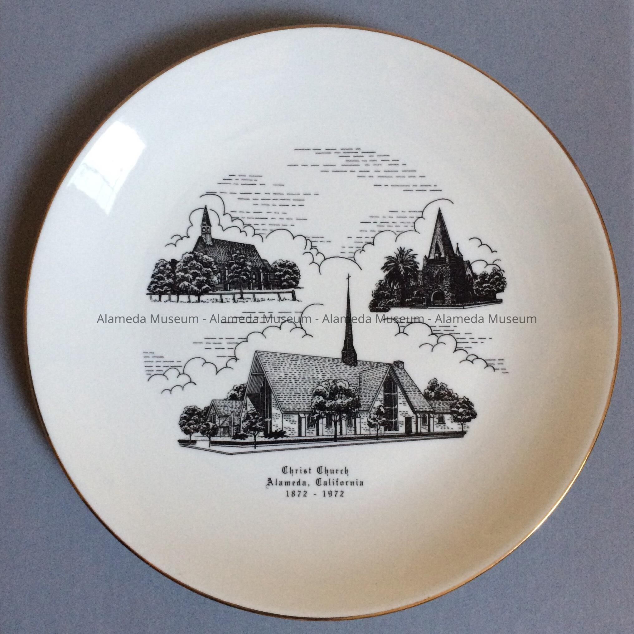 DESCRIPTION: WHITE CHINA PLATE. BLACK TRANSFER ILLUSTRATION IN CENTER OF PLATE DEPICTING THE THREE DIFFERENT STRUCTURES USED BY THE CHRIST EPISCOPAL CHURCH DURING A DECADE OF SERVICE IN ALAMEDA, 1872 TO 1972. AND ON THE REVERSE OF THE PLATE A LIST OF RECTORS FROM 1871 TO 1972.