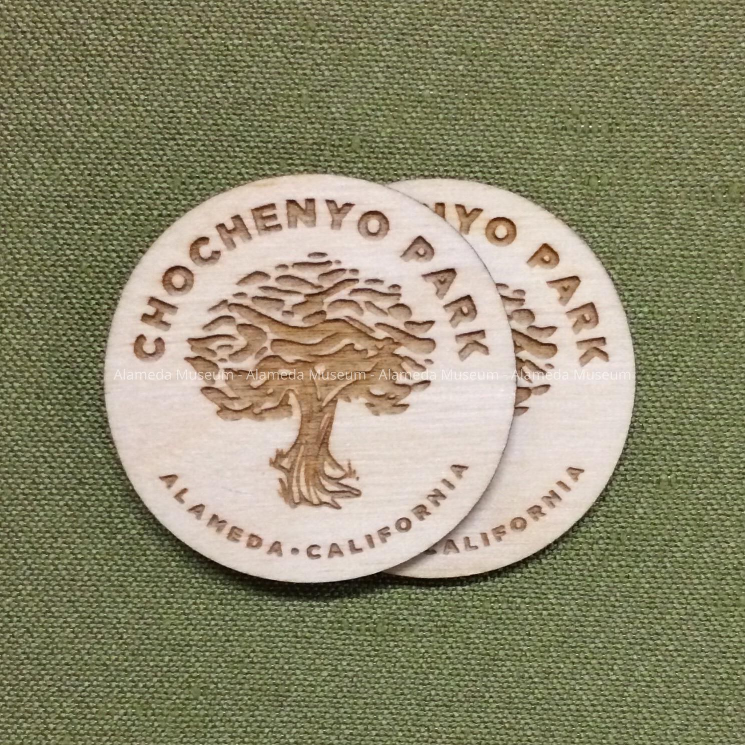 Description: two circular wood tokens, appears to be balsa or similarly light weight wood, stamped on one side with the image of a tree, with above it 'Chochenyo Park', below it, 'Alameda - California'.