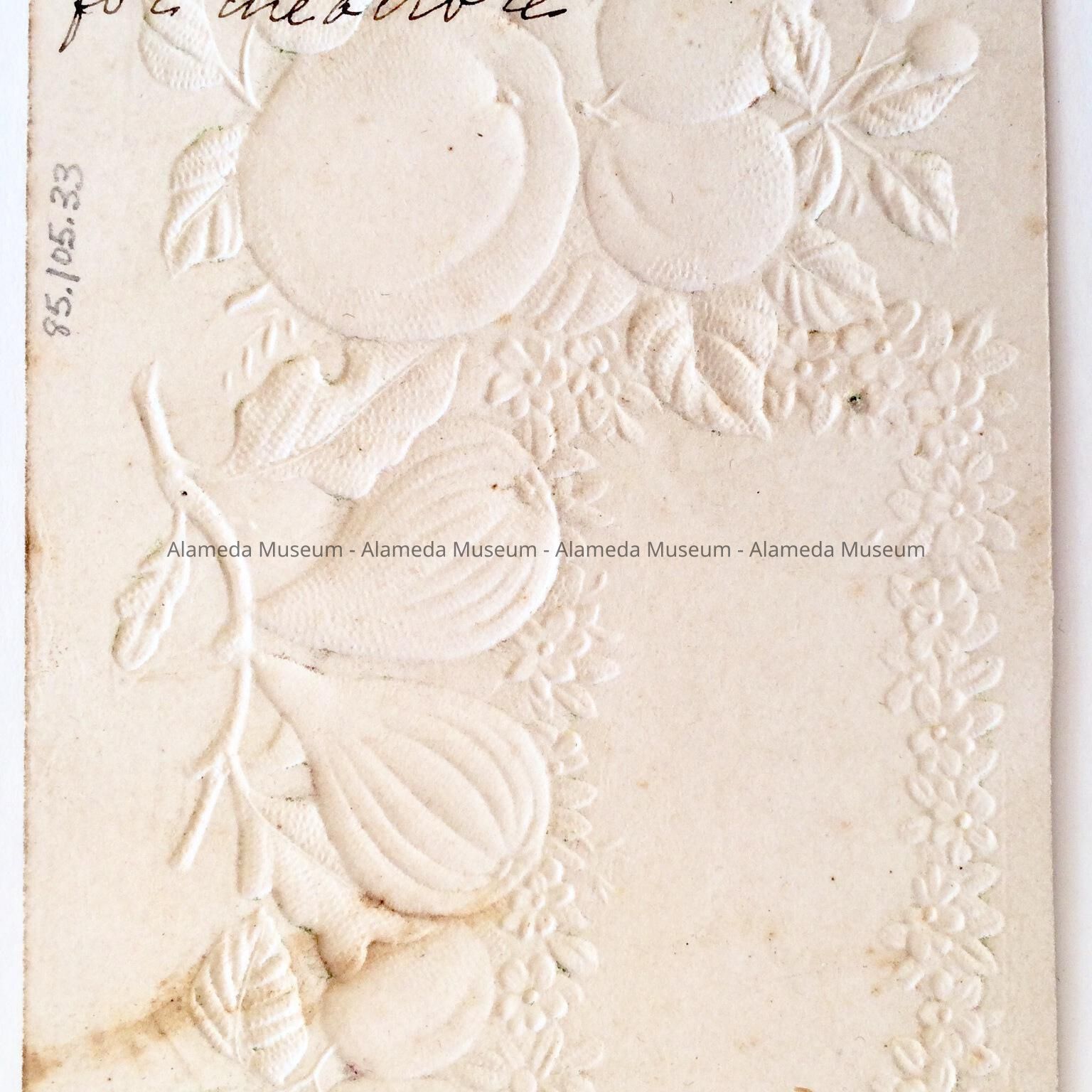 EMBOSSED CHROMOLITHOGRAPHIC CARD + DEPICTING FRUIT.