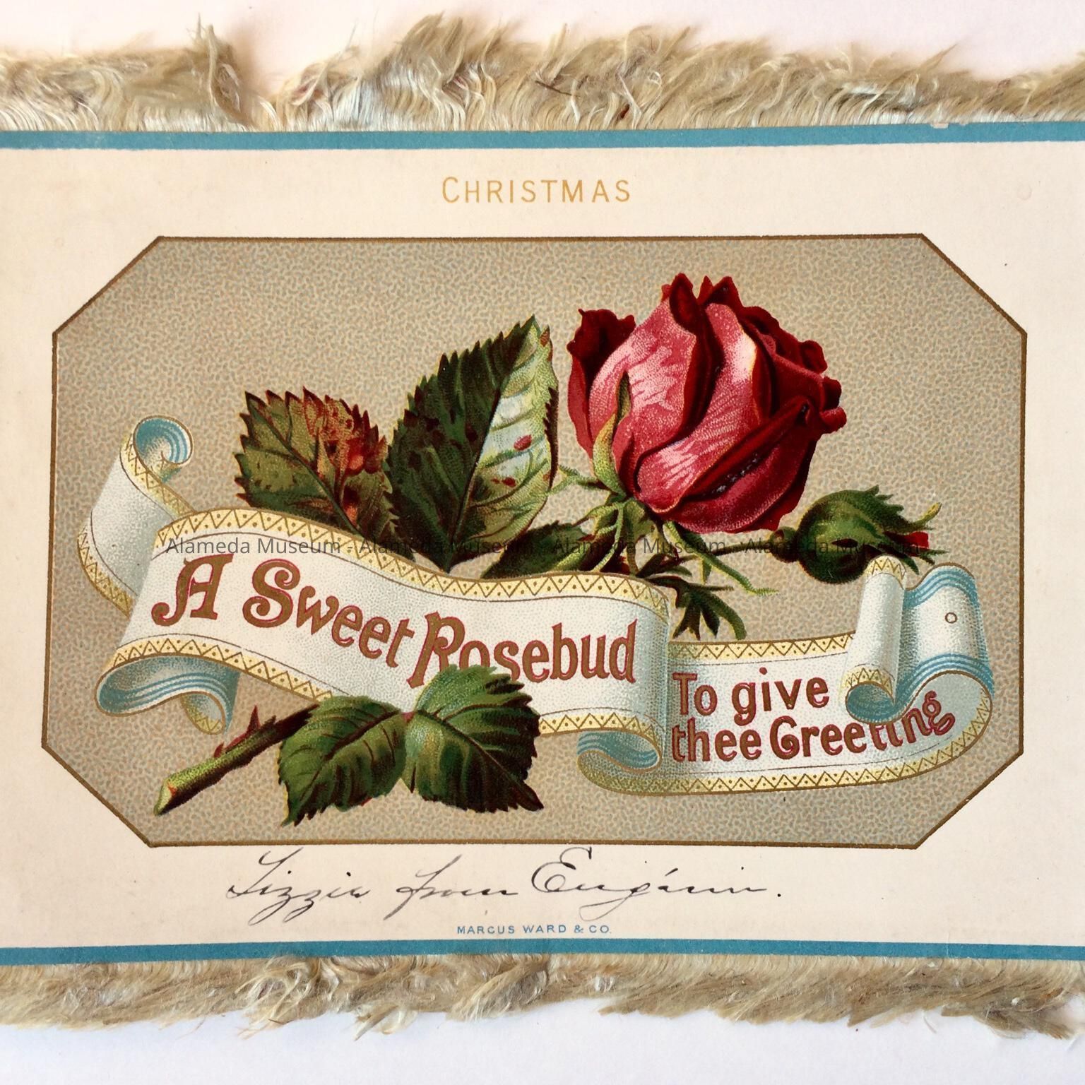 History of Object: Christmas card given to Lizzie (Elizabeth) Chipman, daughter of Wm. W. Chipman (co-founder City of Alameda), and mother of the late Carol Heche.