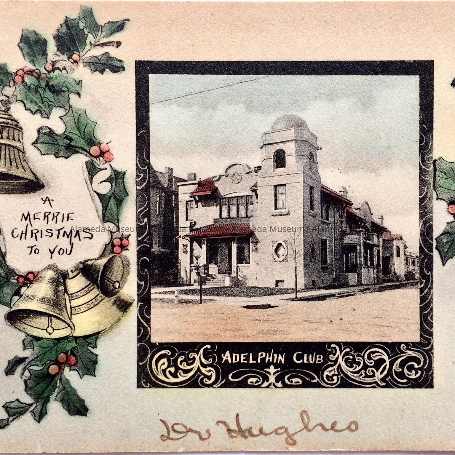 History of Object: Christmas postcard depicting the Adelphian Club building, Walnut Street and Central Avenue, Alameda.