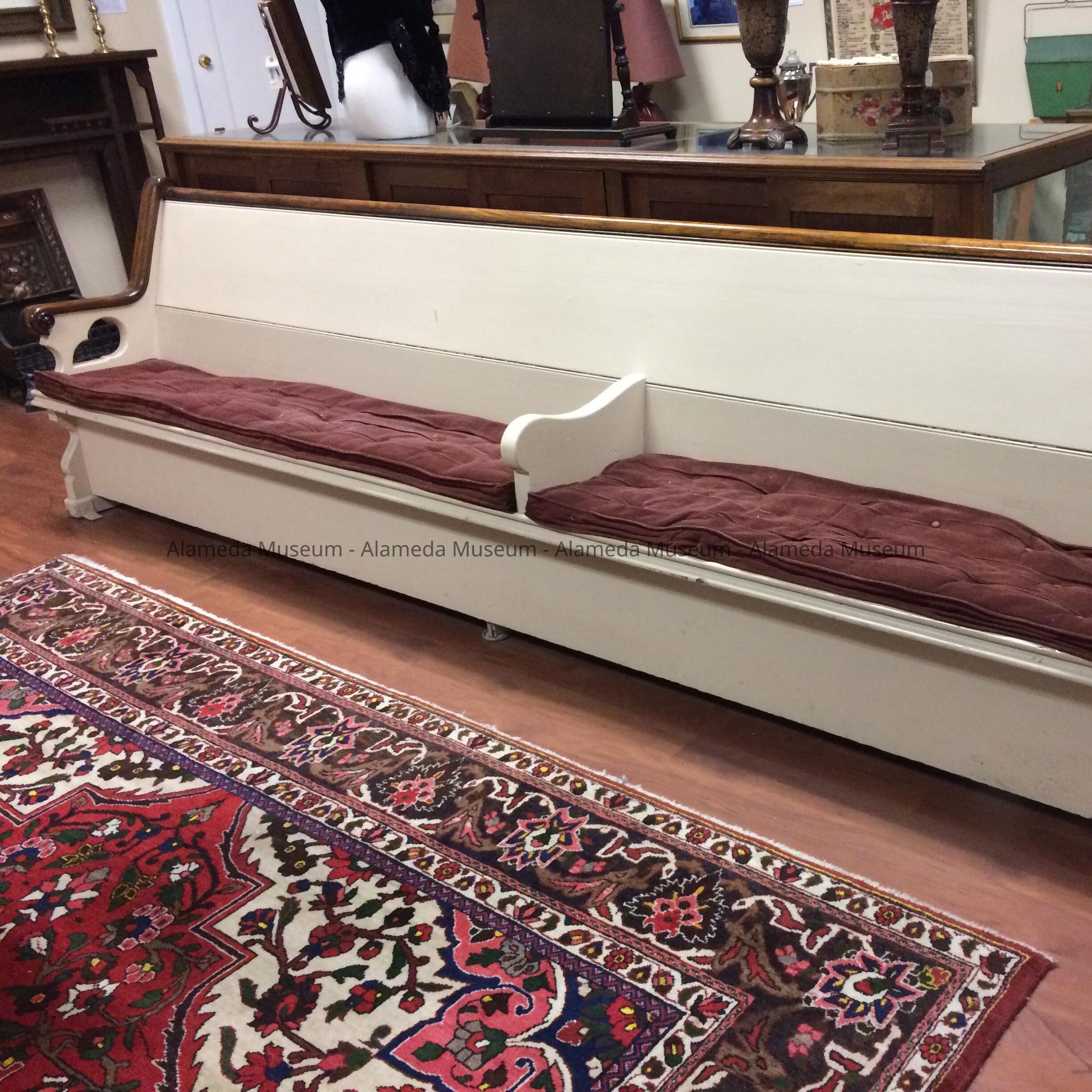 Church pew or bench from the Presbyterian Church, Santa Clara Avenue and Chestnut Street. Erected in 1903 and designed by the noted Alameda resident architect H. H. Meyers.