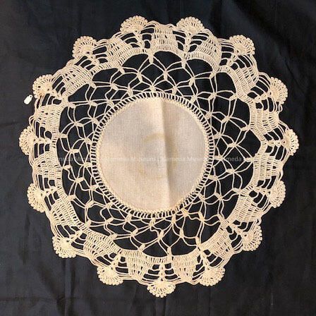 Circular shaped doily consisting of center of unbleached linen with hand crocheted ecru colored lace edging.