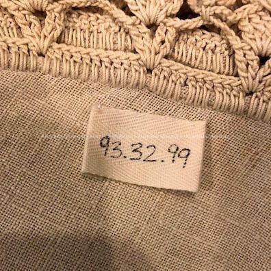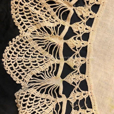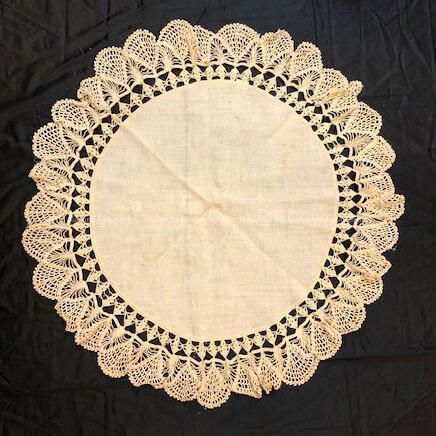Description: Circular tablecloth of heavy unbleached ecru colored linen with flounce of ecru colored hand crocheted lace.