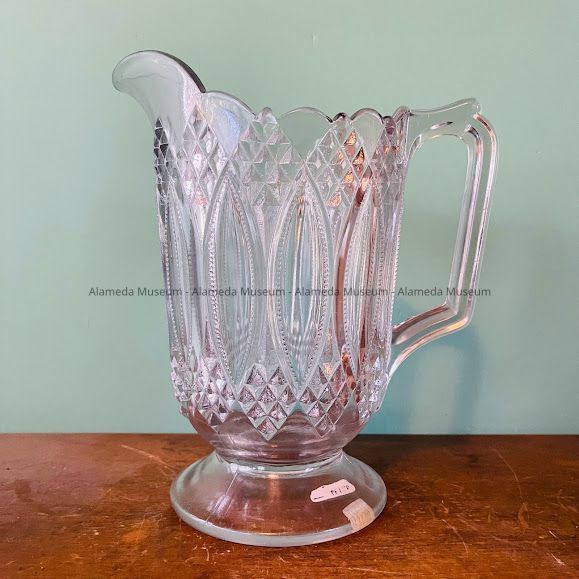 CIRCULAR-SHAPED, FOOTED LEMONADE OR WATER PITCHER, THREE-SEAM, IN A CLEAR PATTERN GLASS.