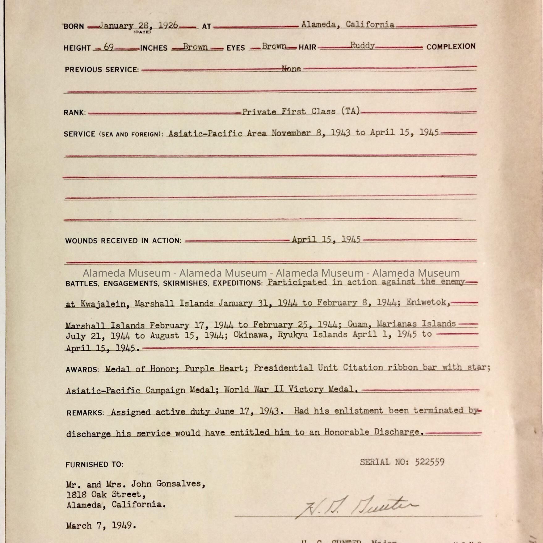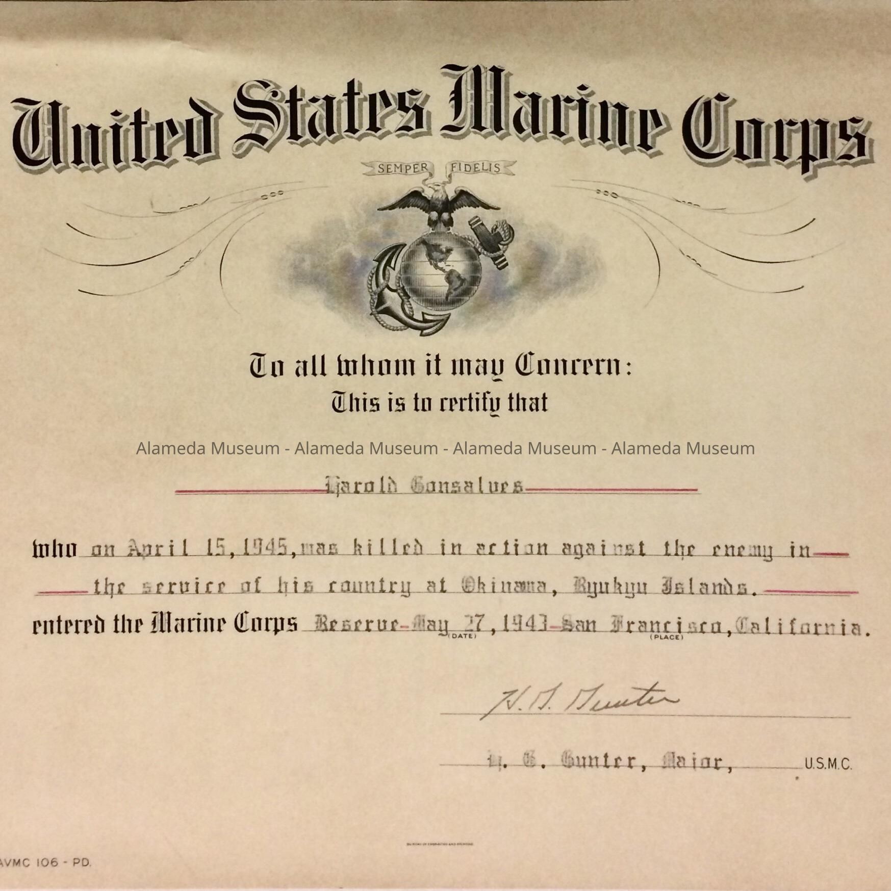 History of Object: A citation awarded posthumously in 1949 to USMC Pfc. Harold Gonsalves; it includes his military history.