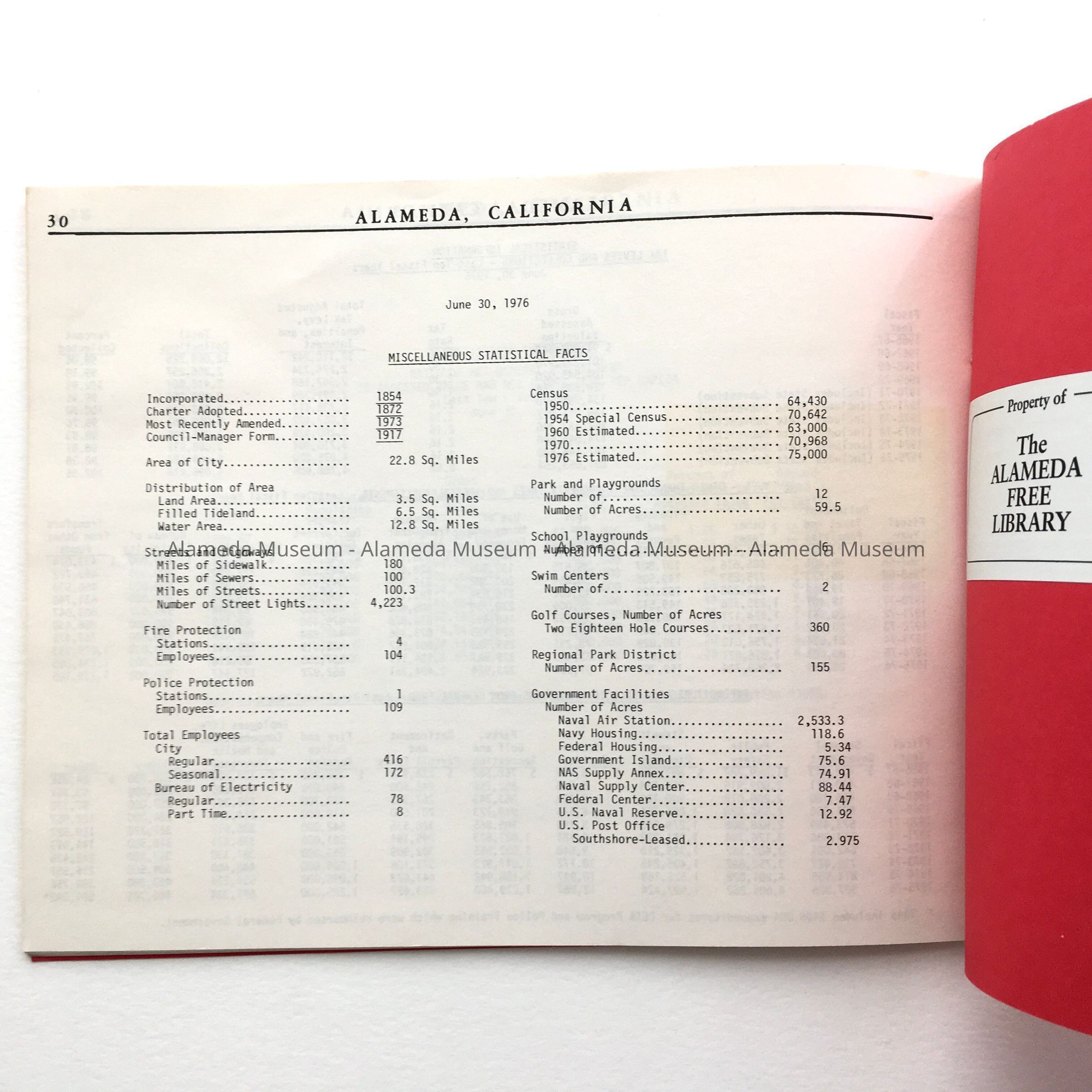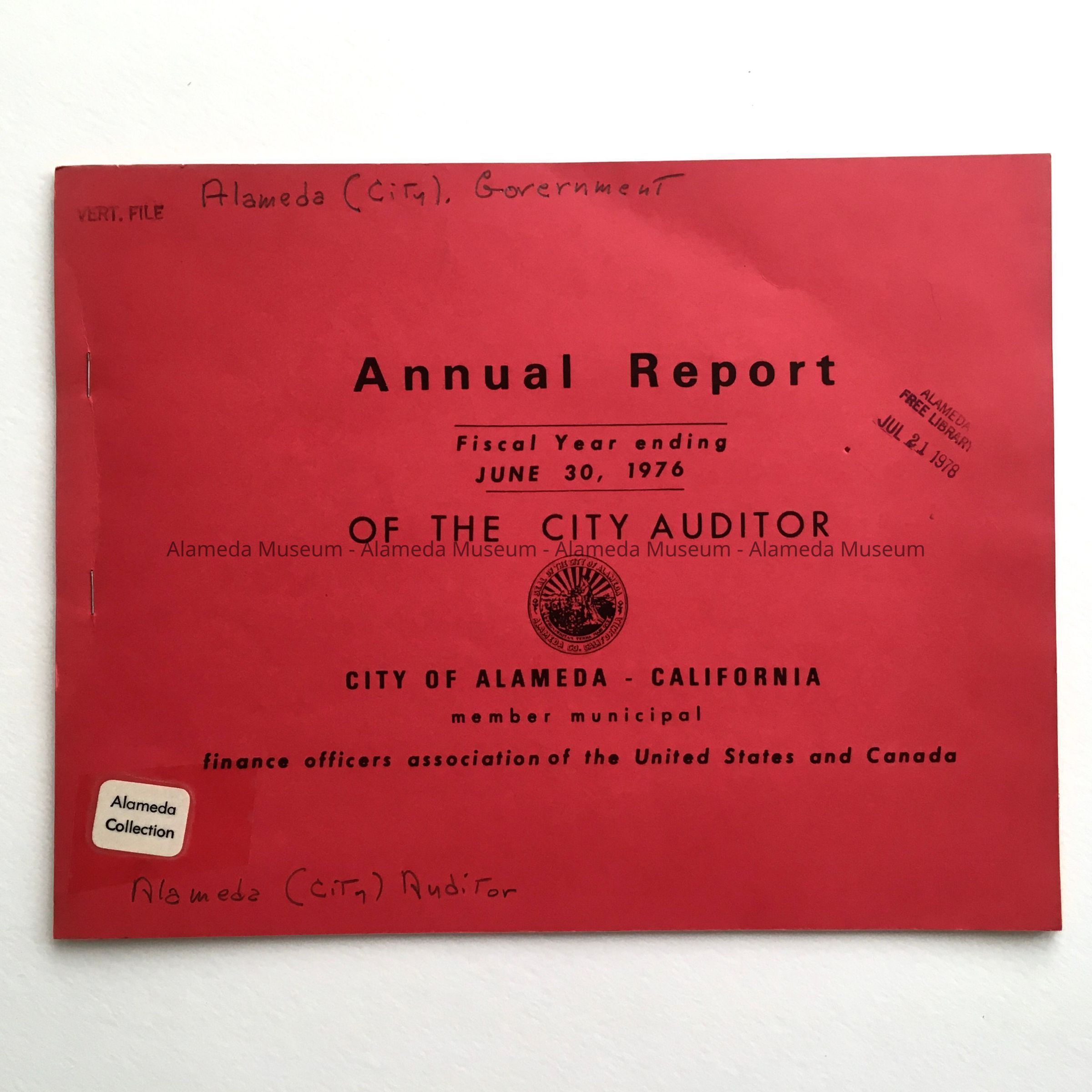 Description: Booklet, printed in landscape format, stapled on the left, with cover of red card stock, with black type text and City Seal. Title: Annual Report - fiscal Year ending June 30, 1976 - of the City Auditor / City of Alameda - California. Has a sticker stating 'Alameda Collection' and on back, a crossed-through bar code from the Alameda Free Library. Also has been stamped and labeled in pencil. Table of Contents has stamp in red with 'Withdrawn'.