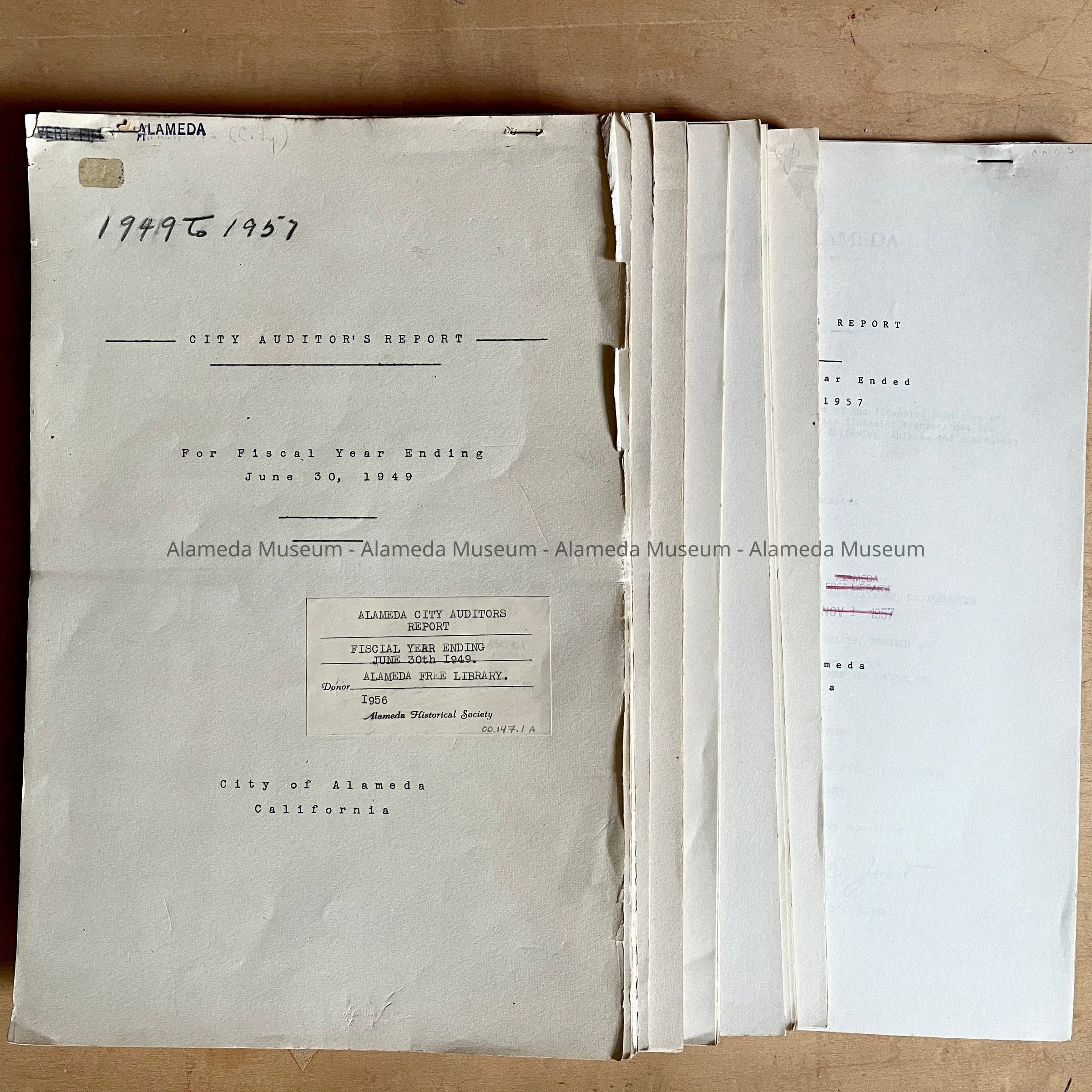 History: Series of Auditor's Reports for 1949, 50, 51, 53, 54, 55, 56 and 57. Given to the Alameda Historical Society in 1956 and never catalogued.
