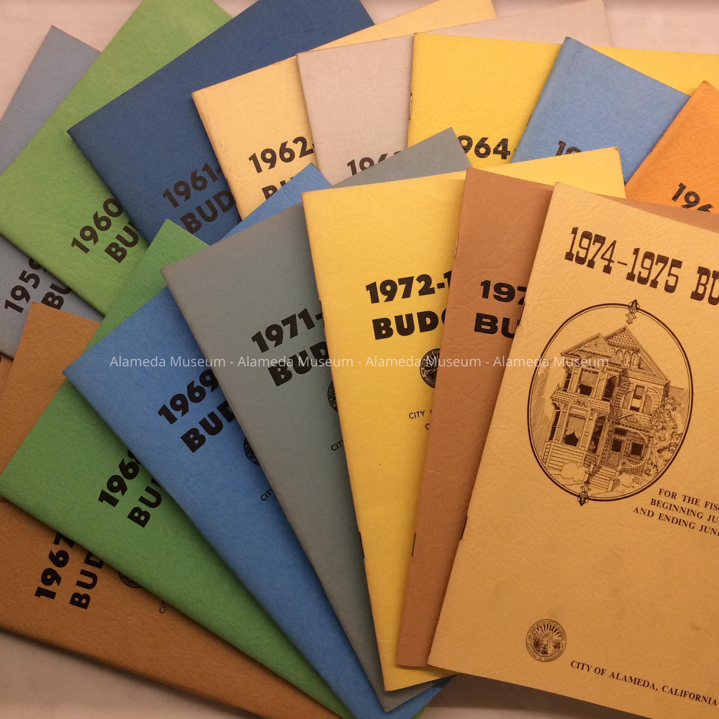 Description: Booklets with leather-look paper covers in various colors. Most have a small picture of the City Seal. A has an illustration of a Victorian house on it. All have Titles of a year, followed by ‘Budget’.