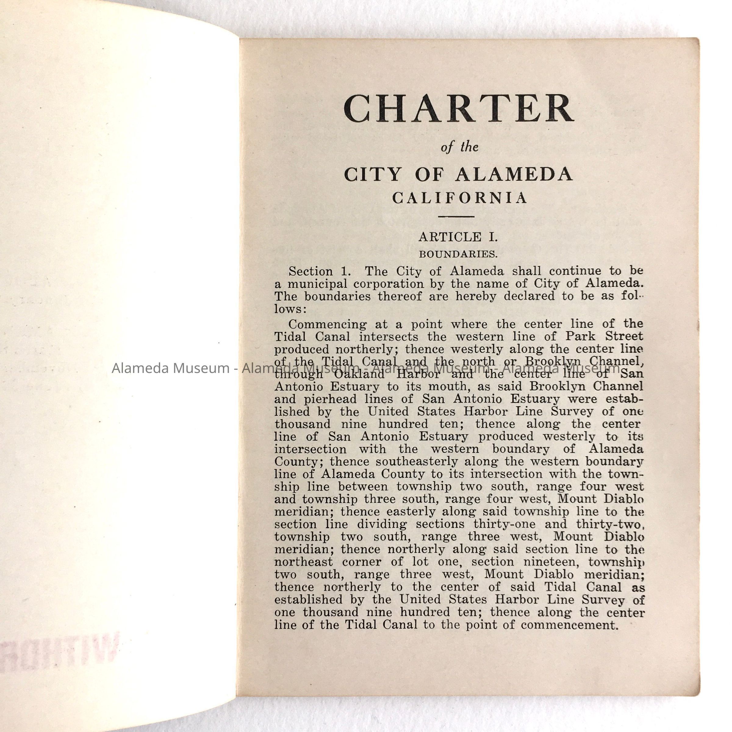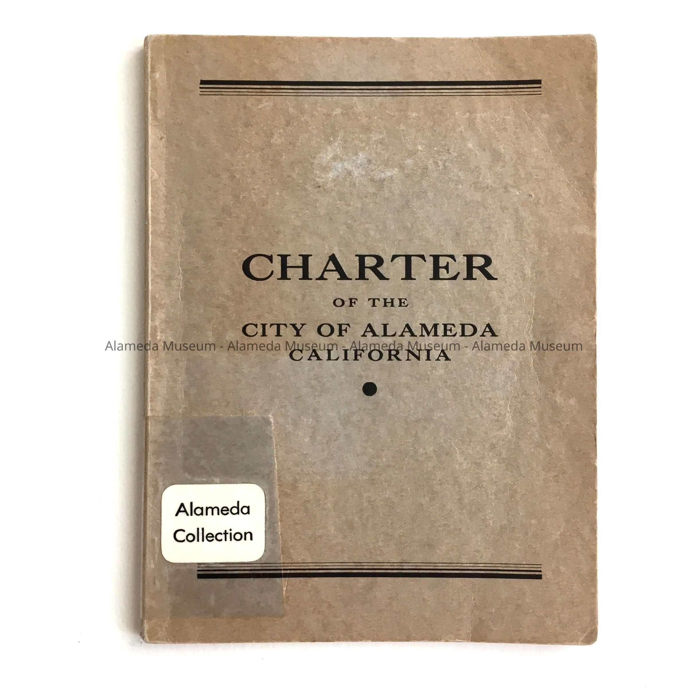 Description: Booklet, 68 printed pages, stapled, inside, with cover of tan card stock decorated with graduating black lines. Title: Charter of the City of Alameda. Has a sticker stating 'Alameda Collection' and a crossed-through bar code from the Alameda Free Library. Fly leaf shows printed by Allied Printers, stamped over in red with 'Withdrawn'.