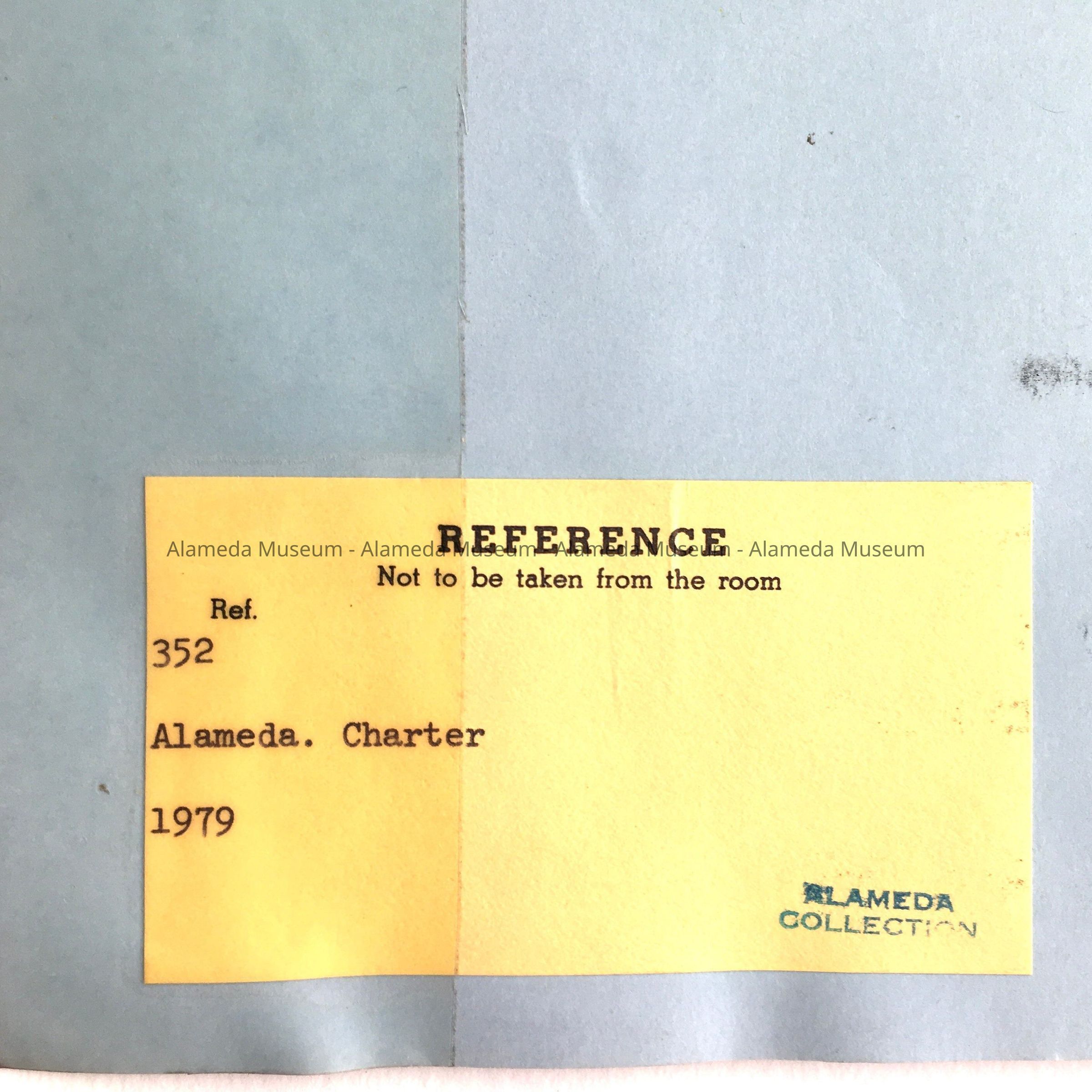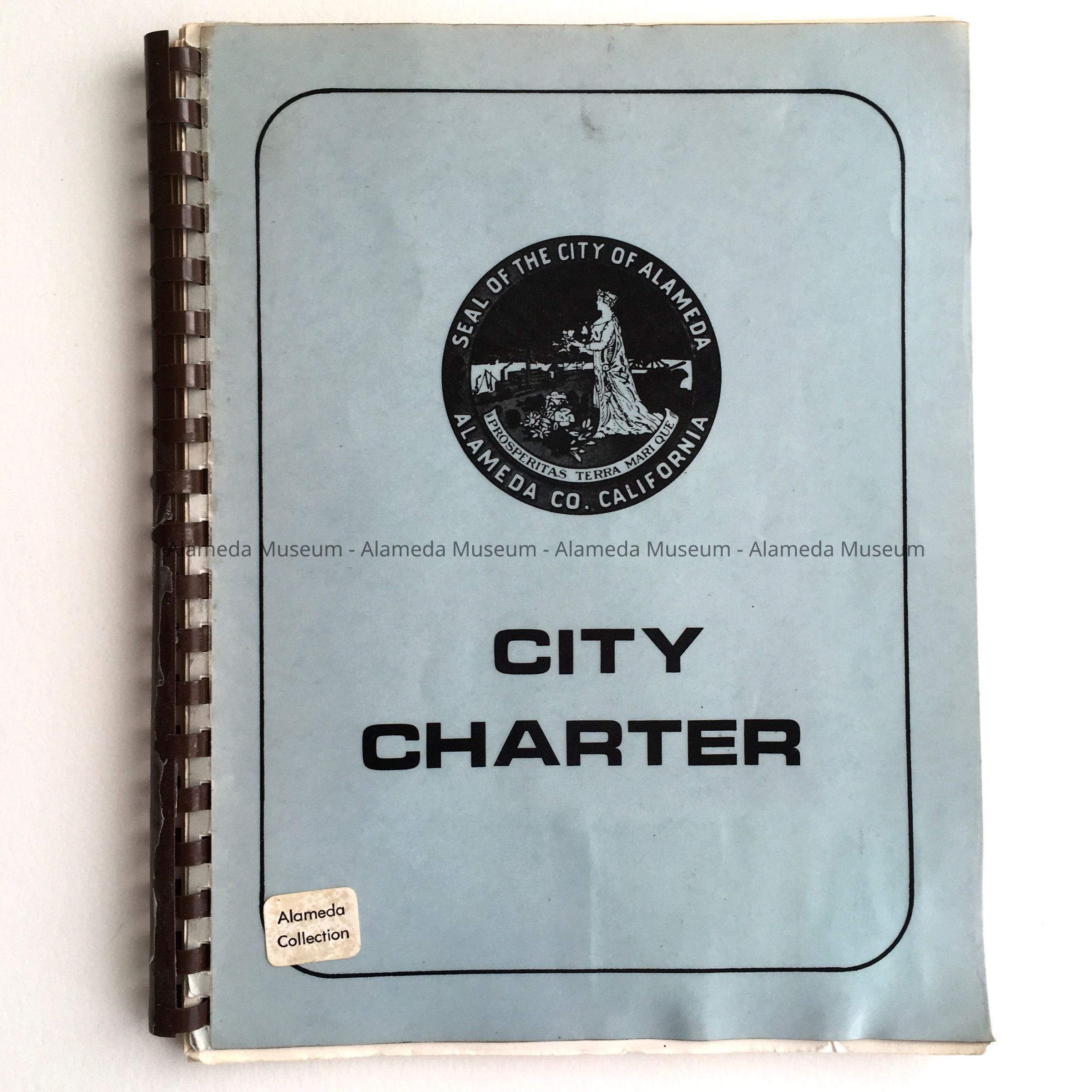 Description: Booklet, 51 mimeographed pages from typed original, with plastic spiral spine, cover is plasticized pale blue card stock decorated with a frame of black lines and seal of the City of Alameda. Title in black printed type: 'City Charter'. Has a sticker stating 'Alameda Collection' and on back, a crossed-through bar code from the Alameda Free Library. Fly leaf shows stamp in red with 'Withdrawn'.