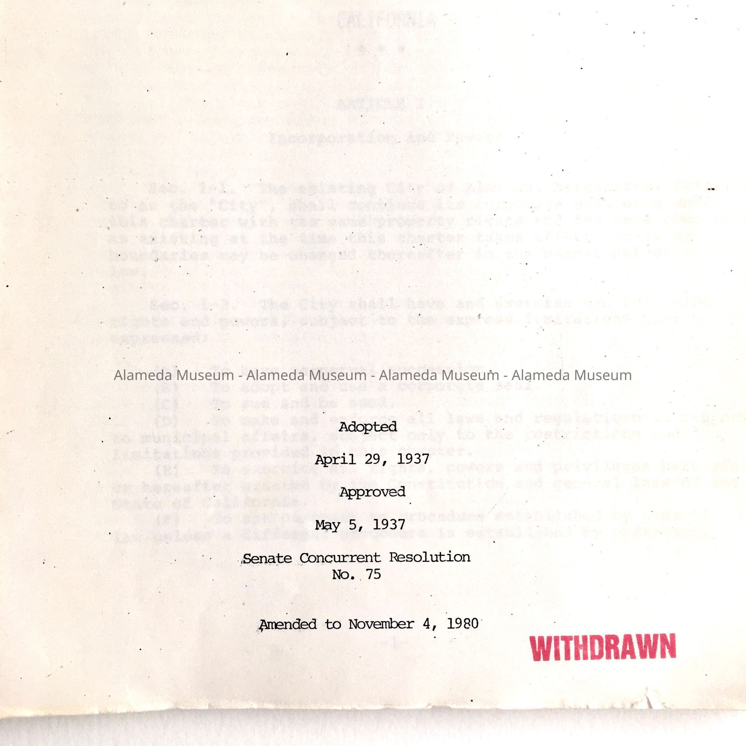 History of Object: Copy of the City Charter as adopted April 29, 1937, Approved May 5, 1937, Amended to November 4, 1980. This was a superfluous copy from the Alameda Free Library Alameda Collection.