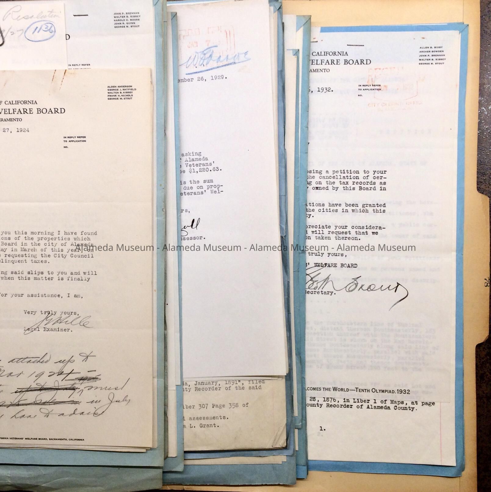 History of Object: Folder with documents found in the attic of City Hall in the 1990s. Documents in this folder pertain to property tax on land owned by Veterans' Welfare Board of California. The Board wanted Alameda to annul or forgive the taxes owed. Includes list of relevant property locations in Alameda, and petitions repeated about every year.