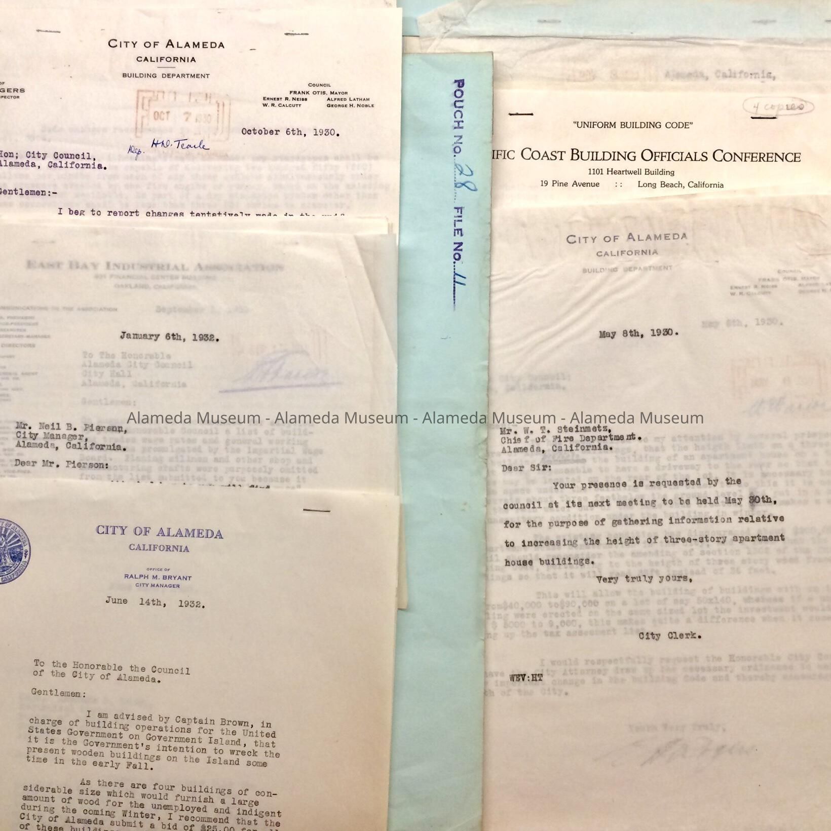 History of Object: Documents found in the attic of City Hall prior to renovation in the 1990s, pertaining to Building issues, such as the Uniform Building Code as set down by the Pacific Coast Building Officials Conference, and changes; wages for workmen and mechanics for public work; suggestion (1932) by City Manager Bryant to buy dilapidated wooden buildings on Government Island, to give the wood to the unemployed. Also petition to build a marquee for the Alameda Theatre (28–15).