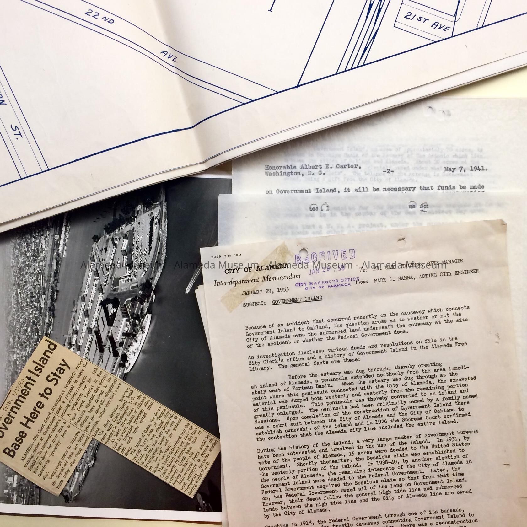 Documents found in the attic of City Hall, prior to renovations. These documents were originally held together with a metal clip in a folder (discarded in 2011) with a green label on the tab stating: "Government Island - Misc.”. Documents in this folder apparently were gathered because of an accident on the causeway to Government Island, and subsequent need to find out who was responsible for cleaning up. Includes documents 1940-1941 describing transfer of deed, reflecting history of usage, including establishment of the Maritime Training School, and a 1930 Map. In addition, folder includes an undated aerial photo, and a 1963 clipping about the decision by the Coast Guard to improve Government Island and not acquire an alternative property.