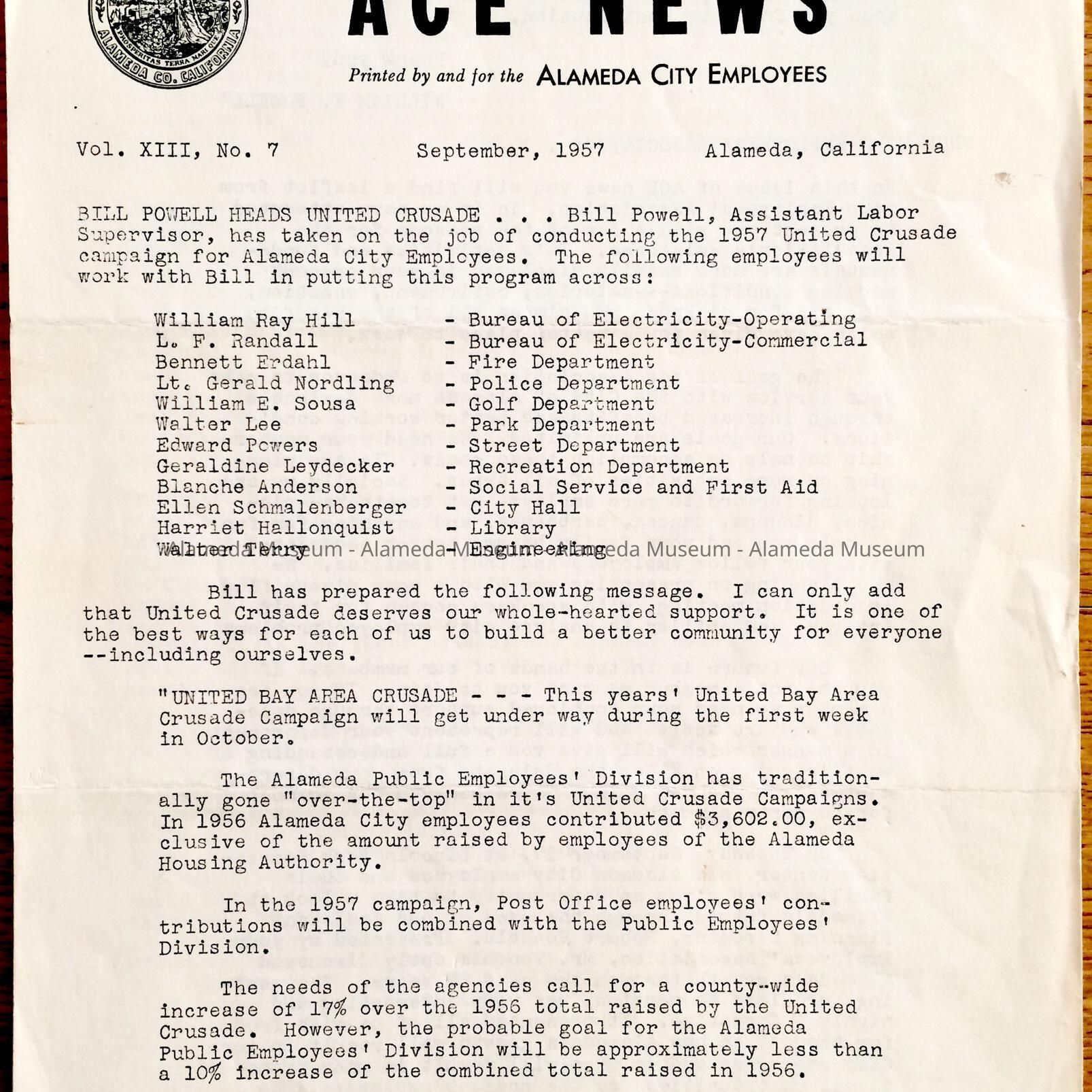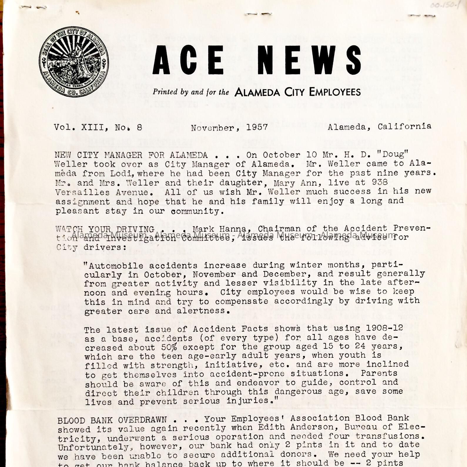 City employee newletter 'ACE News' September and November editions, 1957Entry/Object ID