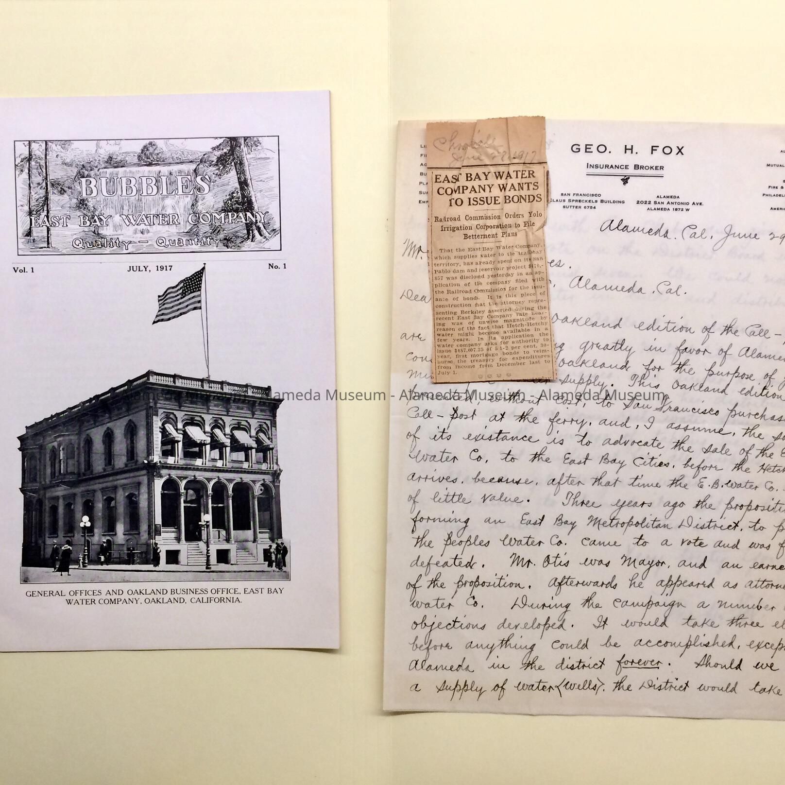 - Newspaper clipping from the Chronicle, about the East Bay Water Company needing bonds, and handwritten letter with opinion about matters by Geo, H. Fox, of San Francisco and 2022 San Antonio Ave.