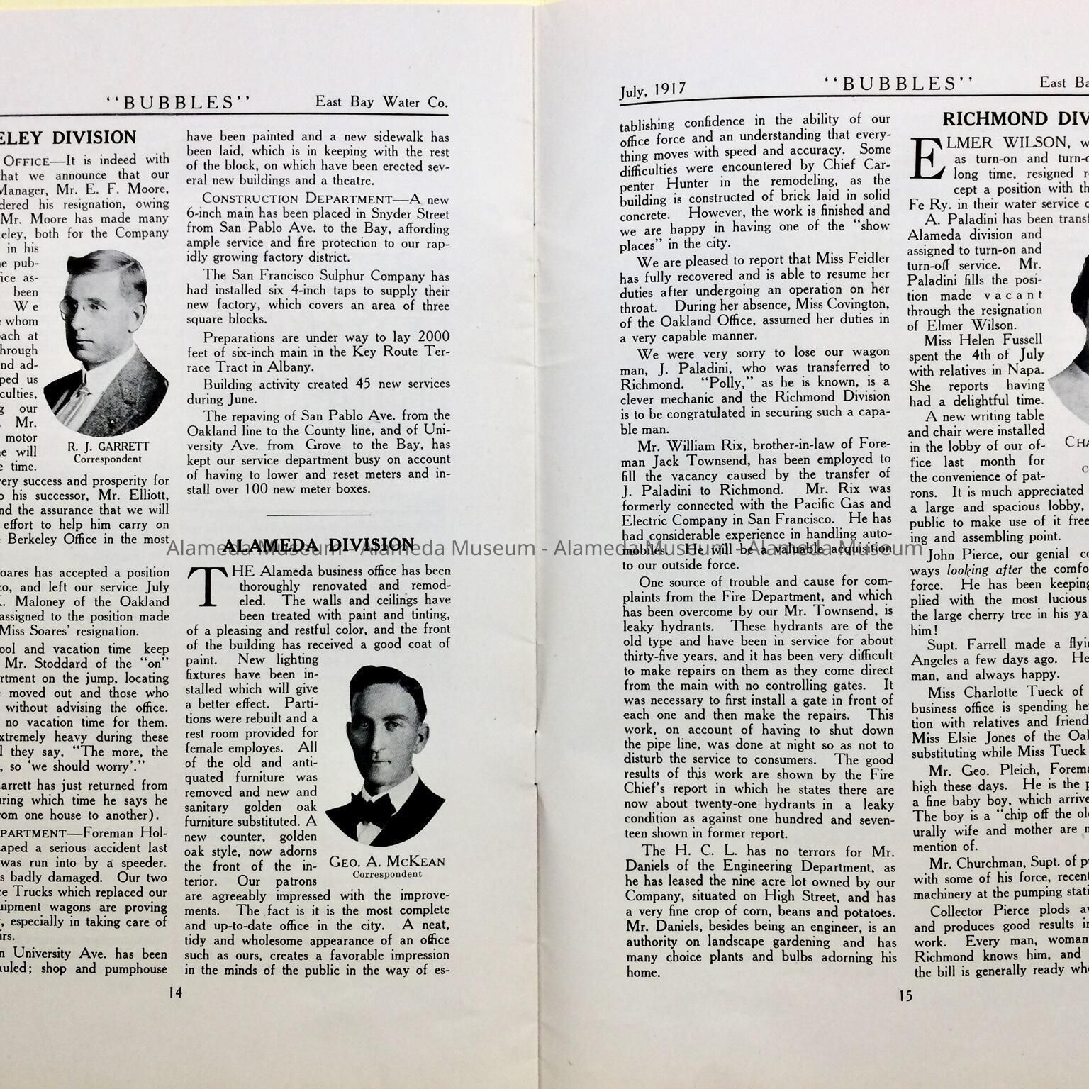 - July, 1917 edition of ‘Bubbles’, East Bay Water Company newsletter. Page 14-15 has an update from the Alameda Division, describing updates to the Alameda office, and the leasing of the High Street property for growing vegetables.