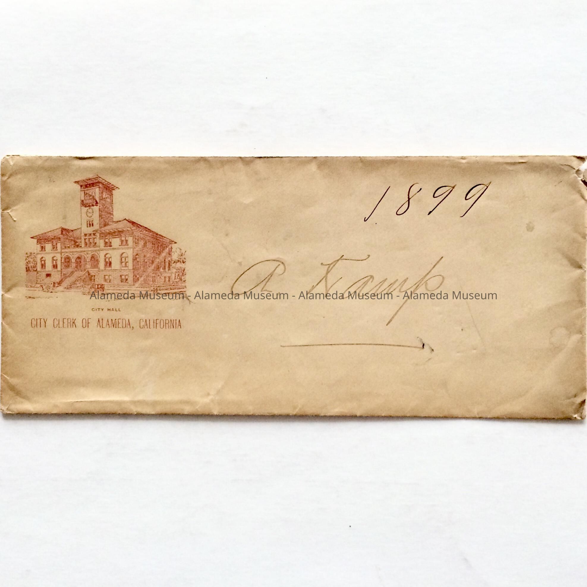 DESCRIPTION: UPPER LEFT HAND CORNER PRINTED DRAWING IN RED, CITY HALL WITH BELL TOWER. BELOW THIS AN INSCRIPTION CITY HALL, CITY CLERK OF ALAMEDA, CALIF. THE ENVELOPE IS ADDRESSED TO A. KAMP, (POLICE OFFICER), 1899.
