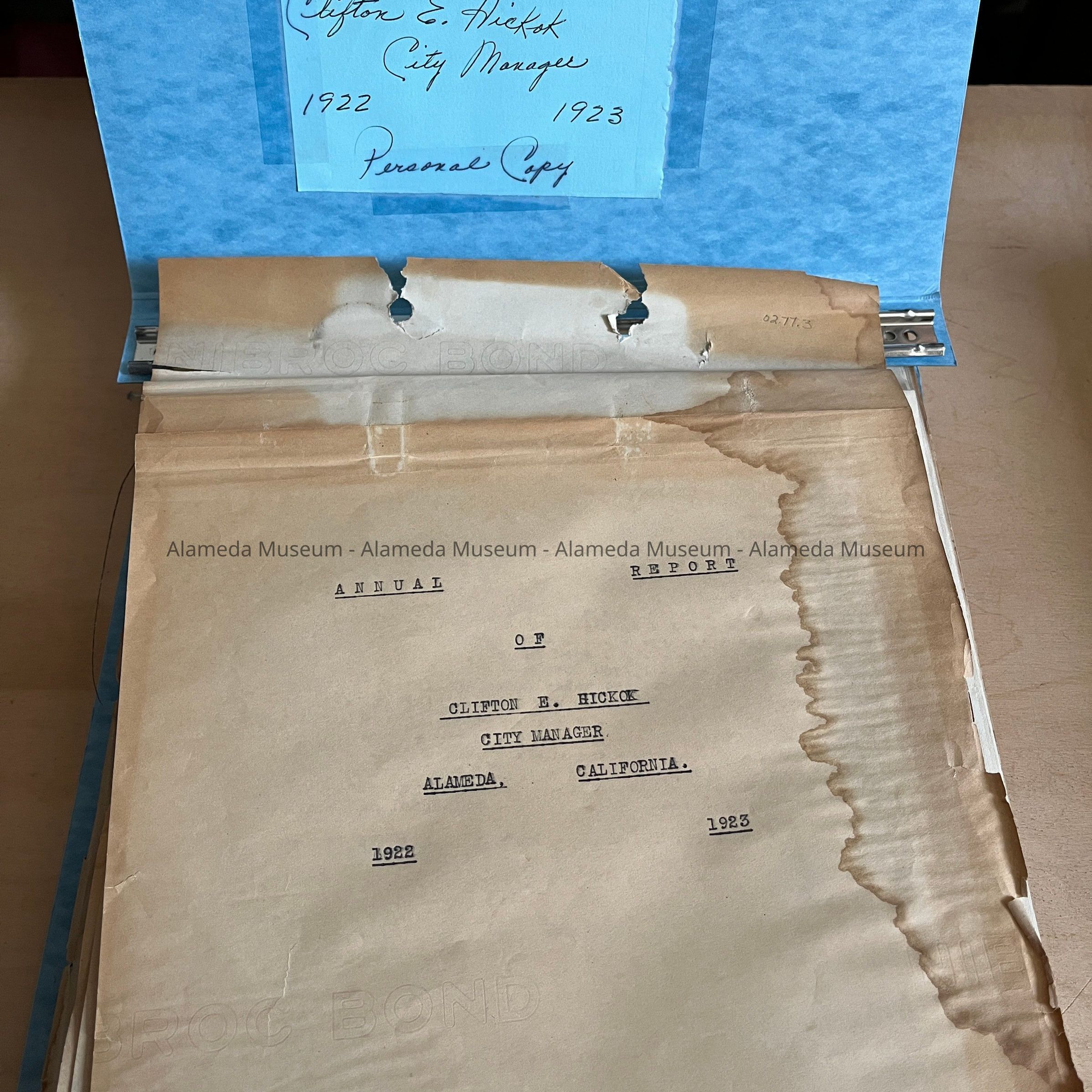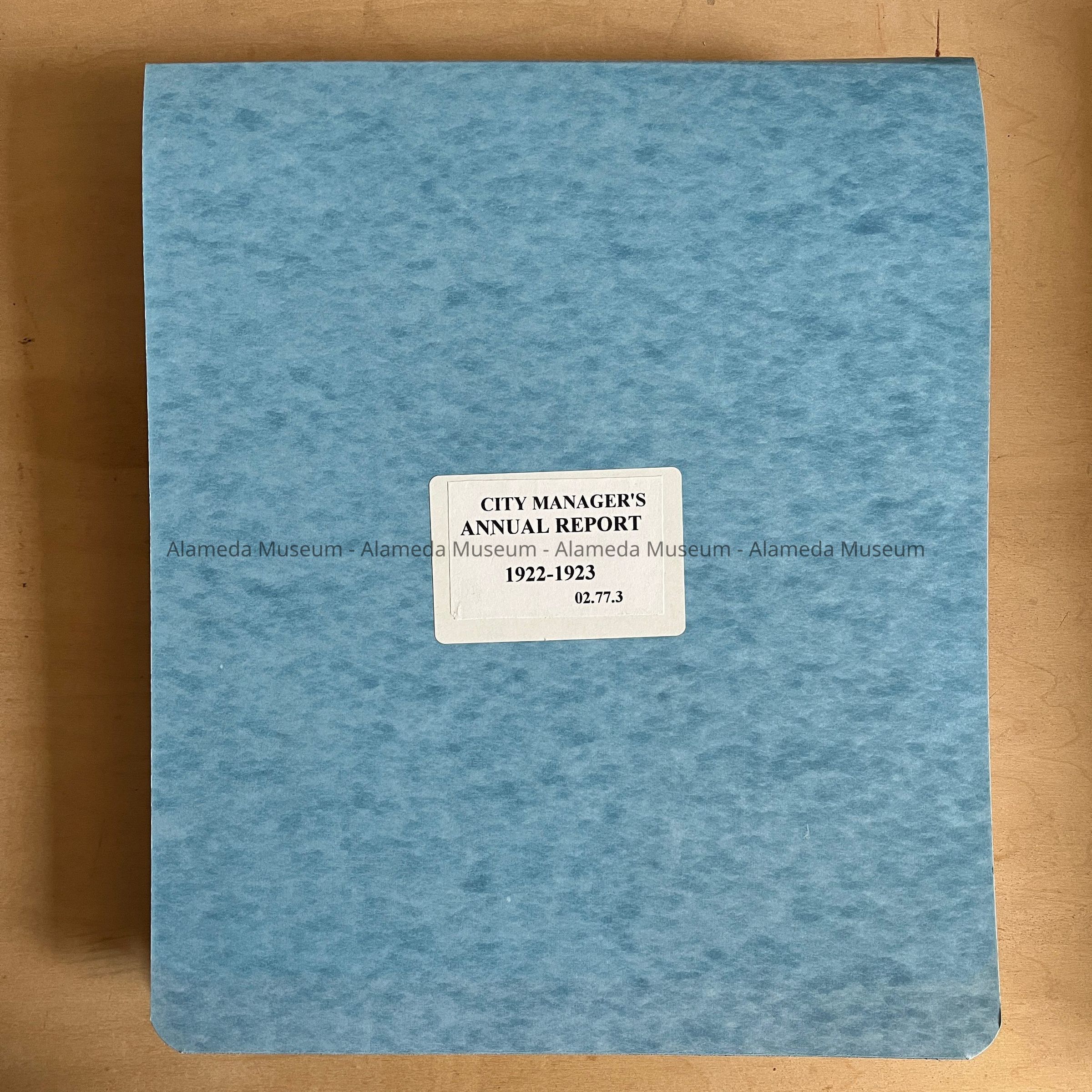 Annual report of Clifton E. Hickok, City Manager Report 1923-24. Included in the report are several interesting photographs, including Versailles Avenue, scenes of Grand and Clinton Streets at San Antonio and Paru, Police motor equipment, hook and fire ladder trucks, Park Street, main library and branch library at Webster Street, Franklin Park. (This and following reports are rebound due to the fact that original covers were water damaged.)