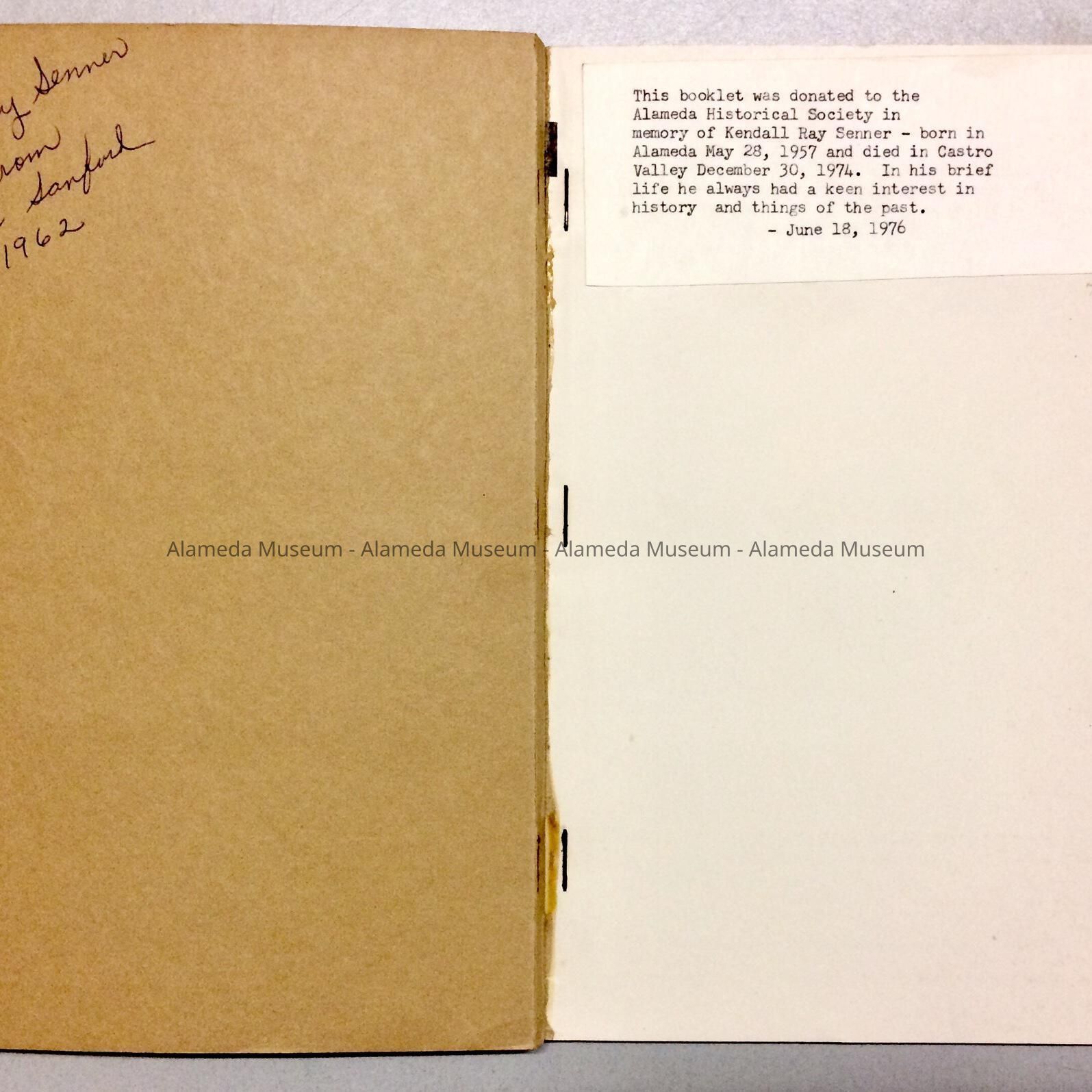 THIS BOOKLET WAS DONATED TO THE ALAMEDA HISTORICAL SOCIETY IN MEMORY OF KENDALL RAY SENNER, BORN IN ALAMEDA MAY 28, 1957 AND DIED IN CASTRO VALLEY, DECEMBER 30, 1974. IN HIS BRIEF LIFE HE ALWAYS HAD A KEEN INTEREST IN HISTORY AND THINGS OF THE PAST. JUNE 18, 1976.