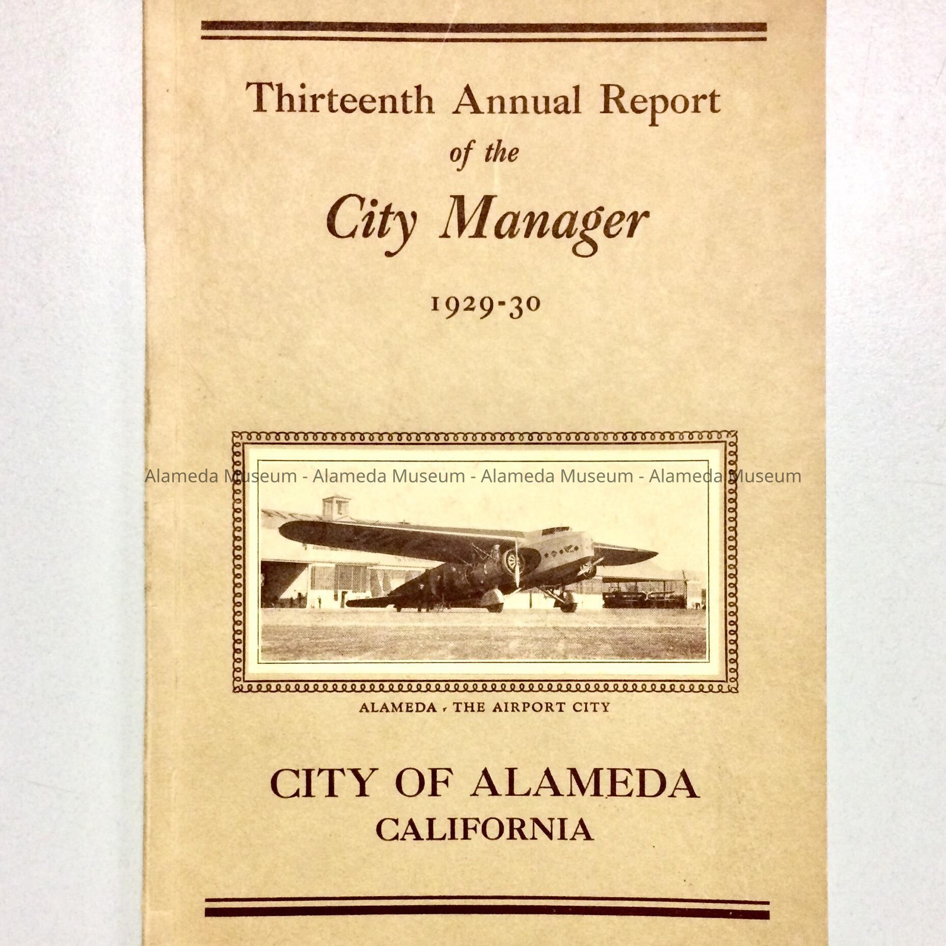 HISTORY OF OBJECT: 13th ANNUAL REPORT OF THE CITY MANAGER, 1929-30, CITY OF ALAMEDA. ILLUSTRATED WITH VIEWS OF THE CITY, BUREAU OF ELECTRICITY, HEALTH DEPARTMENT, S. F. BAY AIRDROME, ETC. ALSO LIST OF CITY OFFICIALS & VITAL STATISTICS.