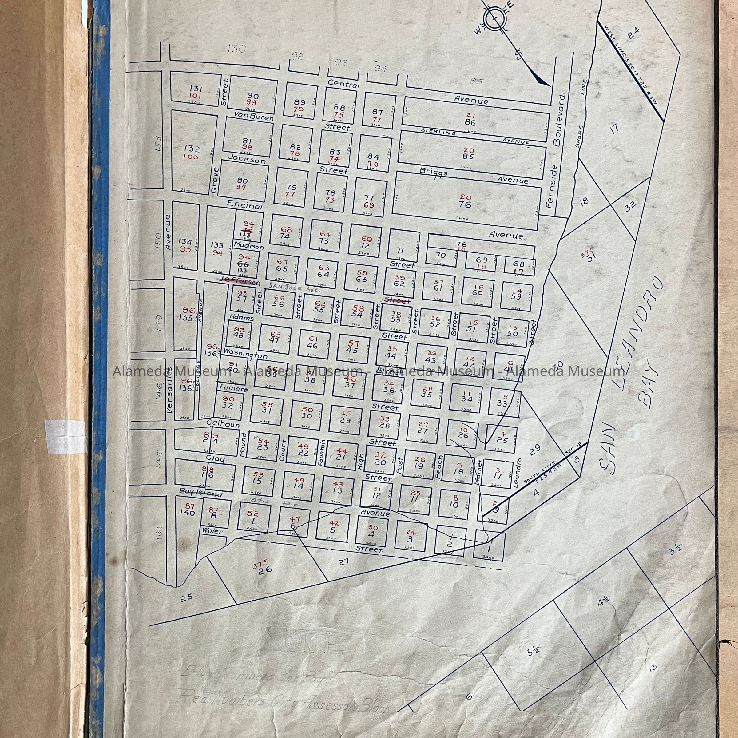 History of Object: A book of overview maps for Alameda City blocks, dated from around 1925, with udated information from about 1930, referring to the City Assessment Block Books.
