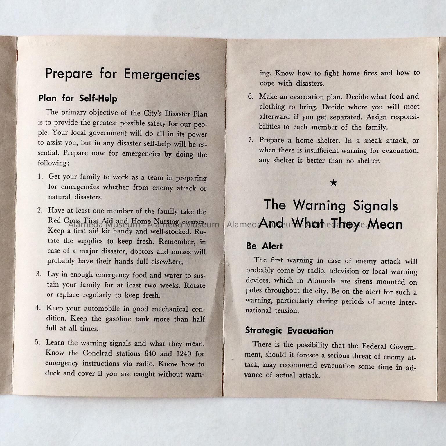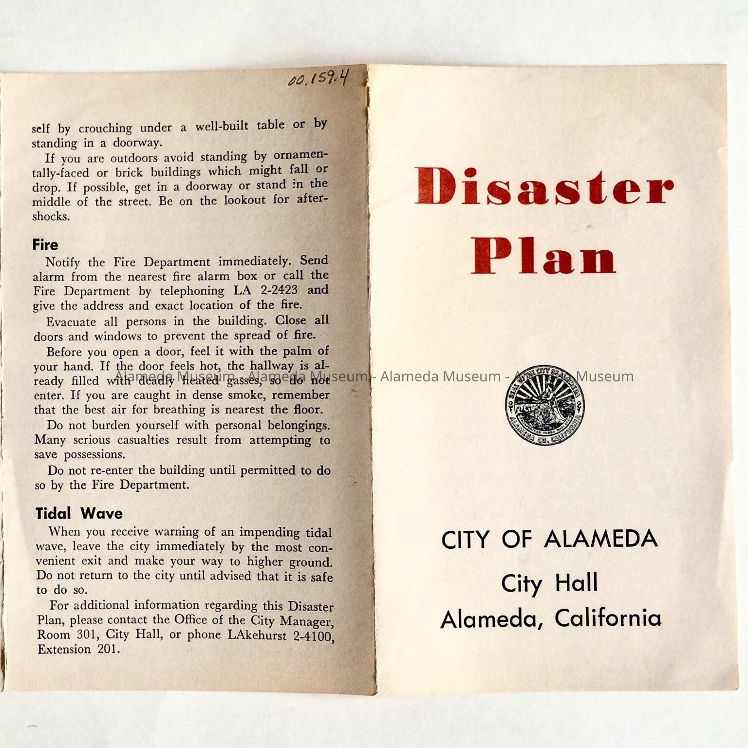 Booklet entitled, “Disaster Plan" issued by the City of Alameda. Issued during the term of William M. McCall, Mayor, City of Alameda.