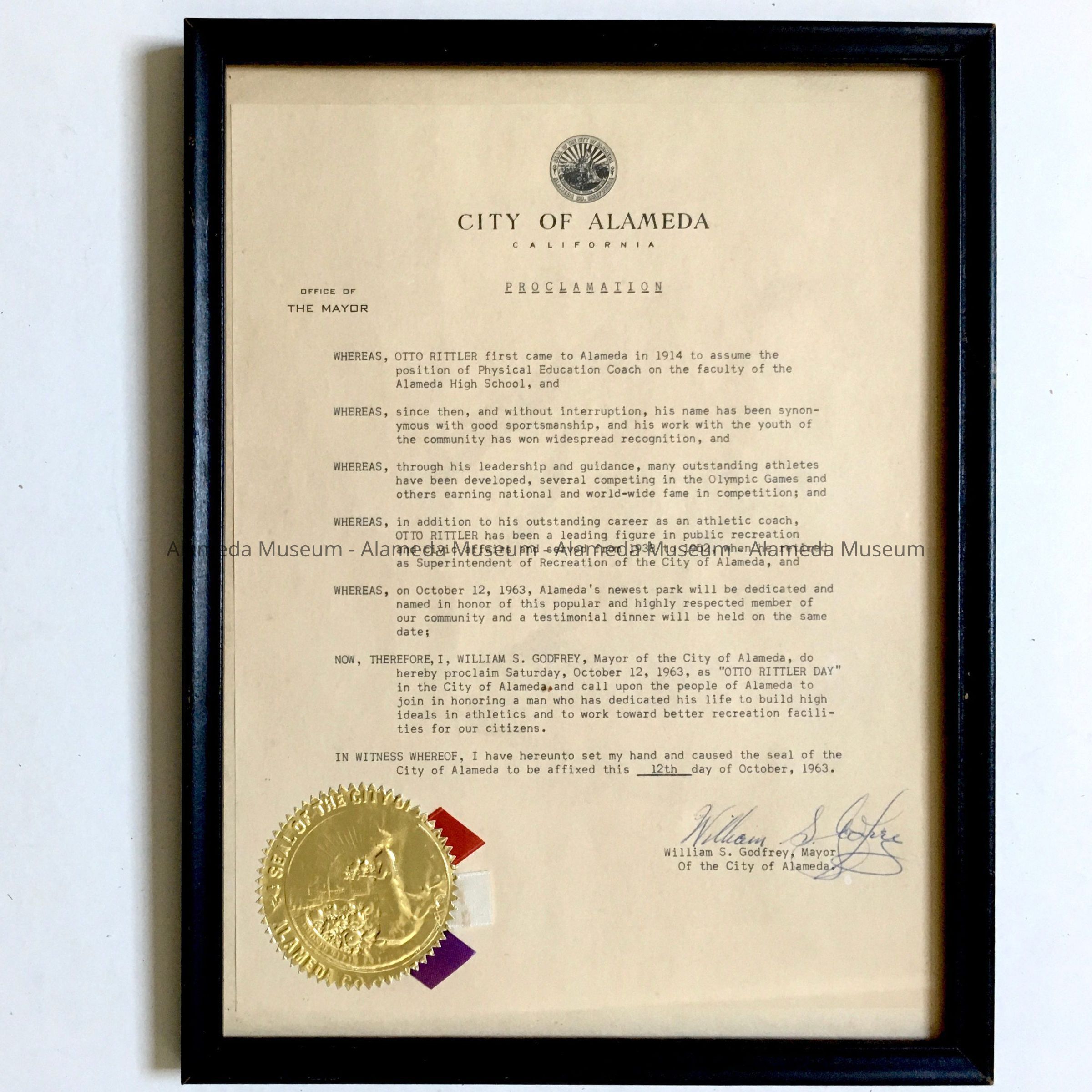 City of Alameda Proclamation of October 12, 1963 as Otto Rittler dayEntry/Object ID