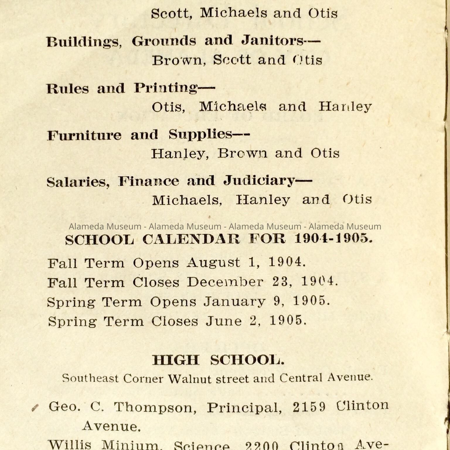 School Directory, City of Alameda for 1904-05 listing the faculty by name at the various schools and their residence addressed. It also includes names and addresses of the Board of Education, Alameda.