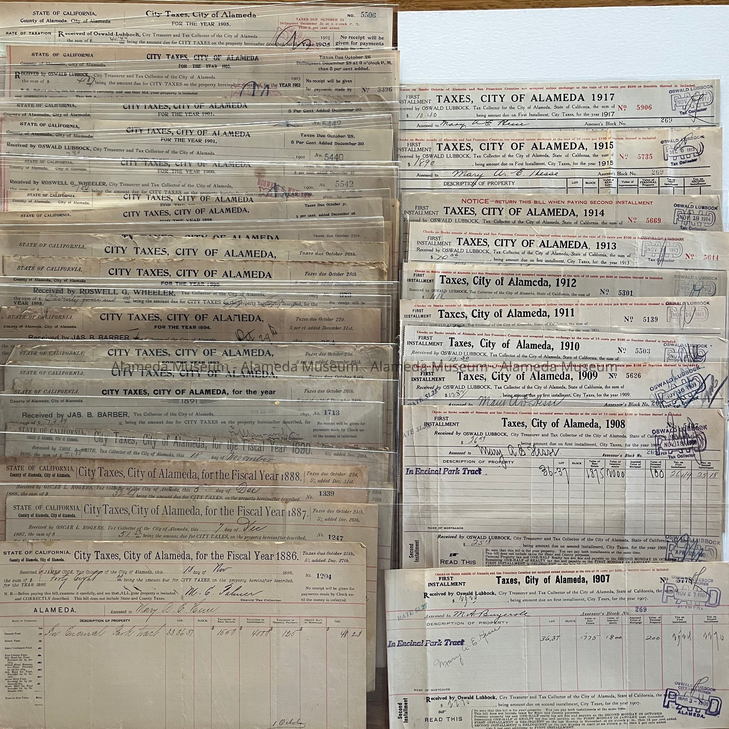 History of Object: City of Alameda Tax forms for Mary A.E. Hesse or Mary A.E. Beyerle (spelled in differing variations), In Encinal Park Tract. The property's address was 1015 Santa Clara Ave., built 1885, still standing today (2023). The Hesse family lived at this address until at least the 1950s, and Walter also owned 6 units behind the house, at 1512-1514 Mozart Street (Building and Engineering news, 1925). These were apparently torn down after his death, the current court dates from 1952.
