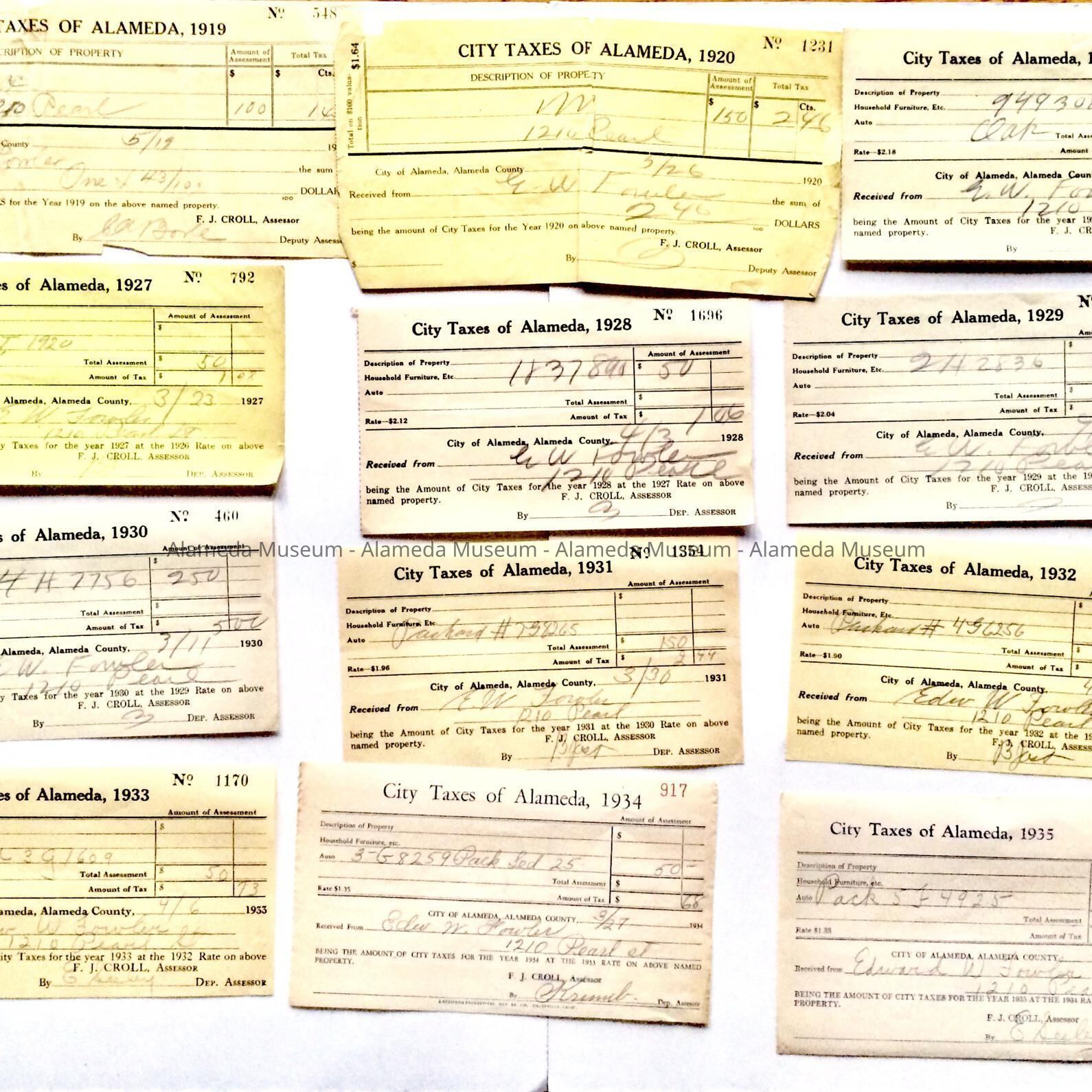 RECEIPT FORMS FOR ALAMEDA CITY TAXES, ISSUED TO EDWARD W FOWLER, 1210 PEARL STREET, ALAMEDA.
