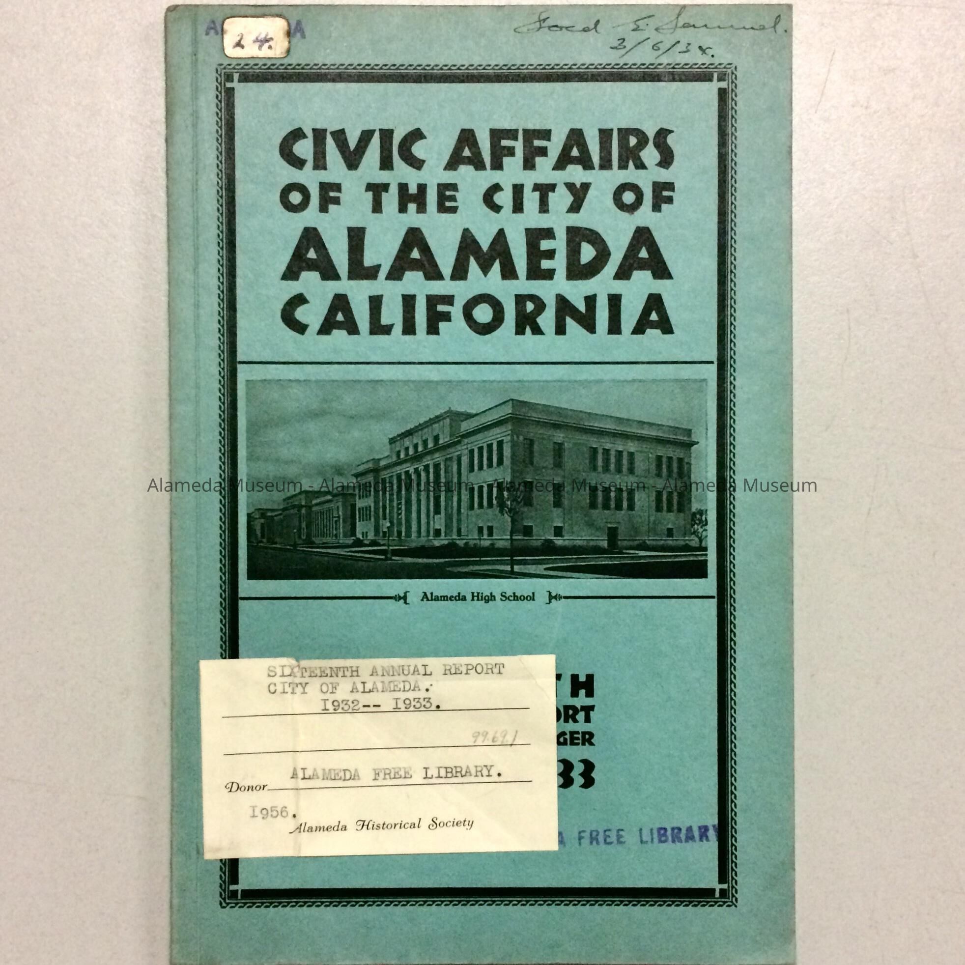 Illustrated 16th Annual Report of the City Manager, Alameda, 1932-1933, Illustrations include Civic Bldgs. Fire Dept., and S.F.Bay Airdrome. This particular copy belonged to the late Ford E.Samuel, Postmaster, City of Alameda.